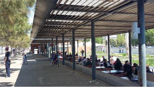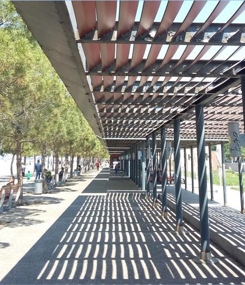 Αν και μπορεί κανείς να εξυπηρετηθεί στο τμήμα αυτό για φαγητό, καφέ ή ποτό, ακολουθεί, αμέσως μετά και το άψογα σχεδιασμένο και θεσμικά χωροθετημένο αναψυκτήριο της Νέας Παραλίας, που ευρίσκεται μέσα στον “Κήπο της Μνήμης” και σκιάζεται από μια θαυμάσια πέργκολα από πλάγιες περσίδες που παίζουν διαρκώς παιχνίδια με το φως, όπως φαίνεται και στις φωτογραφίες που ακολουθούν.