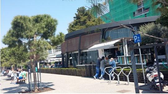 Αλλωστε, όπως φαίνεται και στην επόμενη φωτογραφία, λίγα μέτρα πιο πέρα υπάρχει το μεγάλο παραλιακό αναψυκτήριο του ξενοδοχείου Macedonia Palace που διαθέτει άφθονα τραπεζοκαθίσματα και είδική καντίνα για να πάρει κανείς έναν καφέ, φαγητό ή ποτό και να συνεχίσει τη διαδρομή του απολαμβάνοντάς το σε ένα σκιερό παγκάκι ή στην προκυμαία, όπως κάνουν τα νέα παιδιά το δειλινό και τα βράδια.