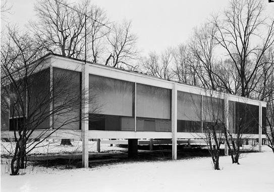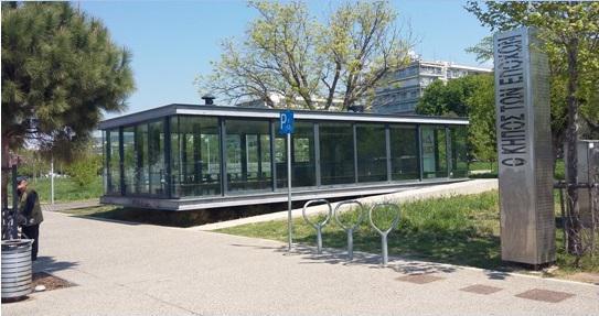 Αμέσως μετά, ακολουθεί, μέσα στον θαυμάσιο “Κήπο των Γλυπτών”, το 5ο στη σειρά περίπτερο που είναι, κατά τη γνώμη μου, το πιο όμορφο και ενδιαφέρον απ’ όλα. Ελαφρώς υπερυψωμένο, μοιάζει να επιπλέει πάνω στο νερό και παραπέμπει έντονα στο Pavillon της Βαρκελώνης και σε μια εξοχική κατοικία του Mies Van der Rohe, όπως φαίνεται και στις επόμενες 2 φωτογραφίες. Εννοείται πως είναι (και πρακτικά) αδύνατο να επεκταθεί ο ζωτικός του χώρος με πρόσθετα τραπεζοκαθίσματα, θα μπορούσε όμως, κάλλιστα, να γίνει εκθετήριο έργων τέχνης υπο την επιμέλεια των Μουσείων της πόλης, χωρίς αυτό να αποκλείει τη δυνατότητα λειτουργίας ενός μικρού μπαρ, στο αυστηρό πλαίσιο πάντοτε της στεγασμένης επιφάνειας του περιπτέρου.
