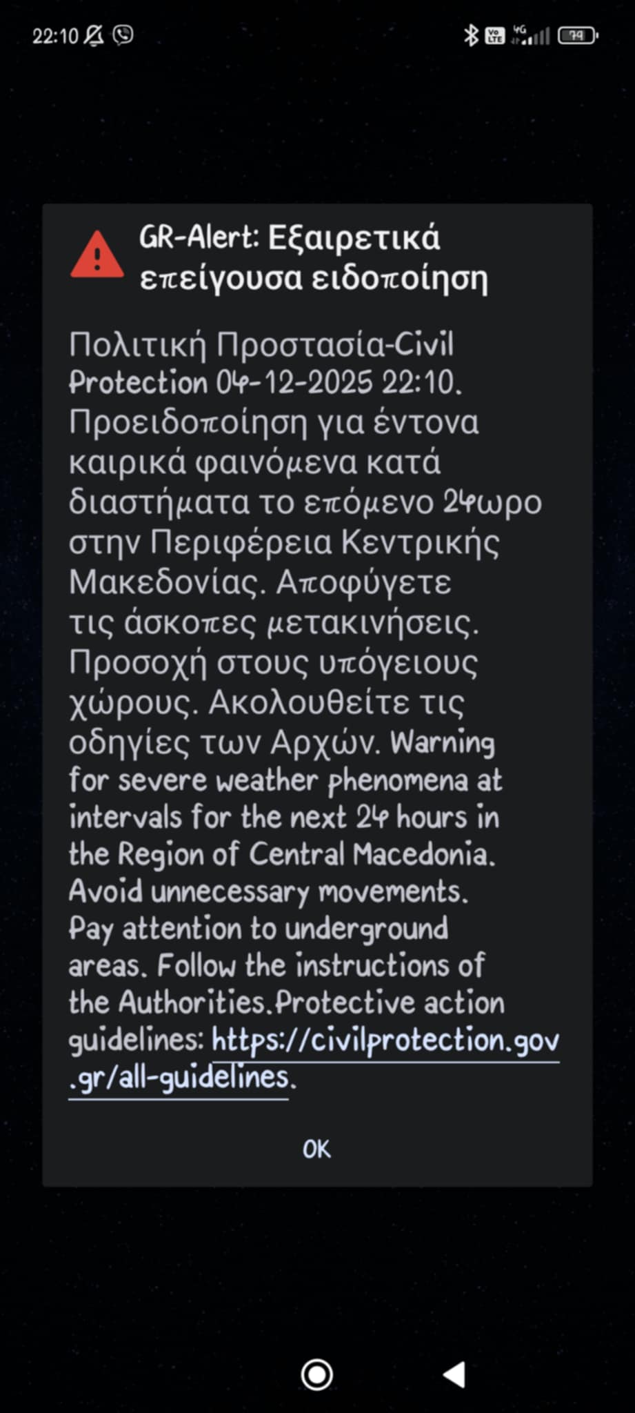 Προειδοποίηση για έντονα καιρικά φαινόμενα κατά διαστήματα το επόμενο 24ωρο στην Περιφέρεια Κεντρικής Μακεδονίας. Αποφύγετε άσκοπες μετακινήσεις. Προσοχή στους υπόγειους χώρους. Ακολουθείτε τις οδηγίες των Αρχών.