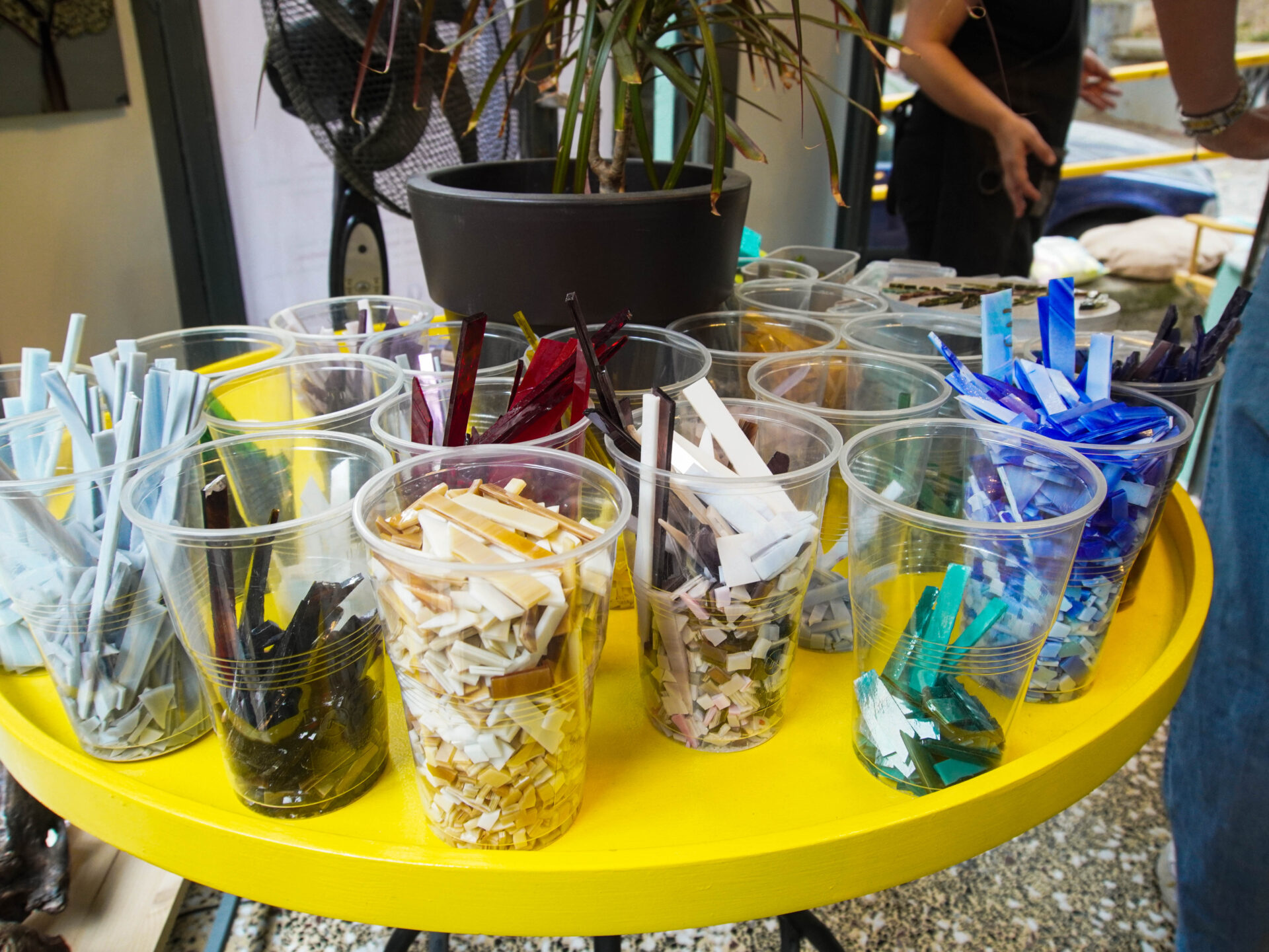 «Προσπαθούμε να κάνουμε όση περισσότερη ανακύκλωση μπορούμε», τονίζει η Καμίλα ενώ μου δείχνει έργα τα οποία έχουν προκύψει από κομμάτια γυαλιού που ήταν απλά «περισσεύματα».
