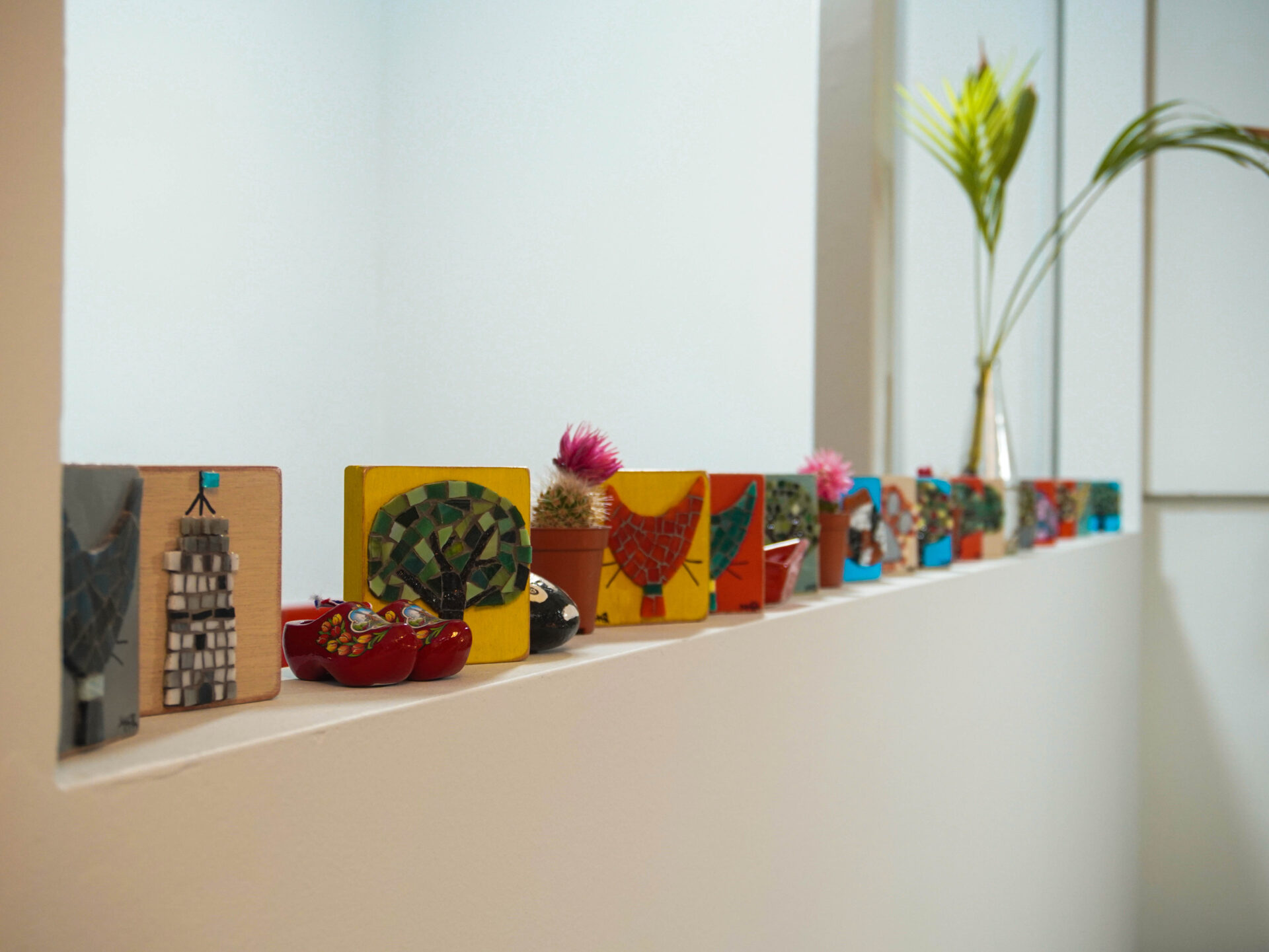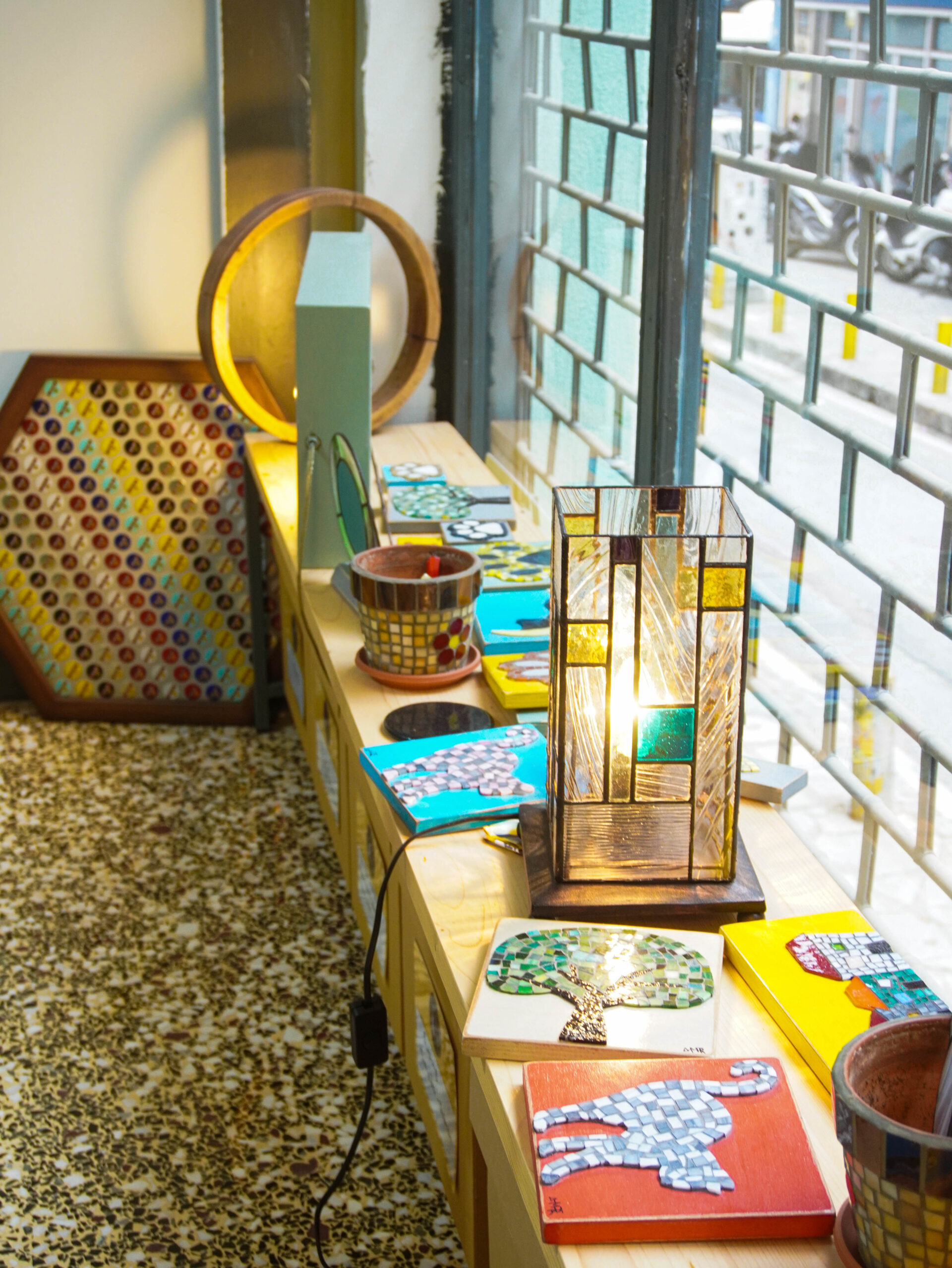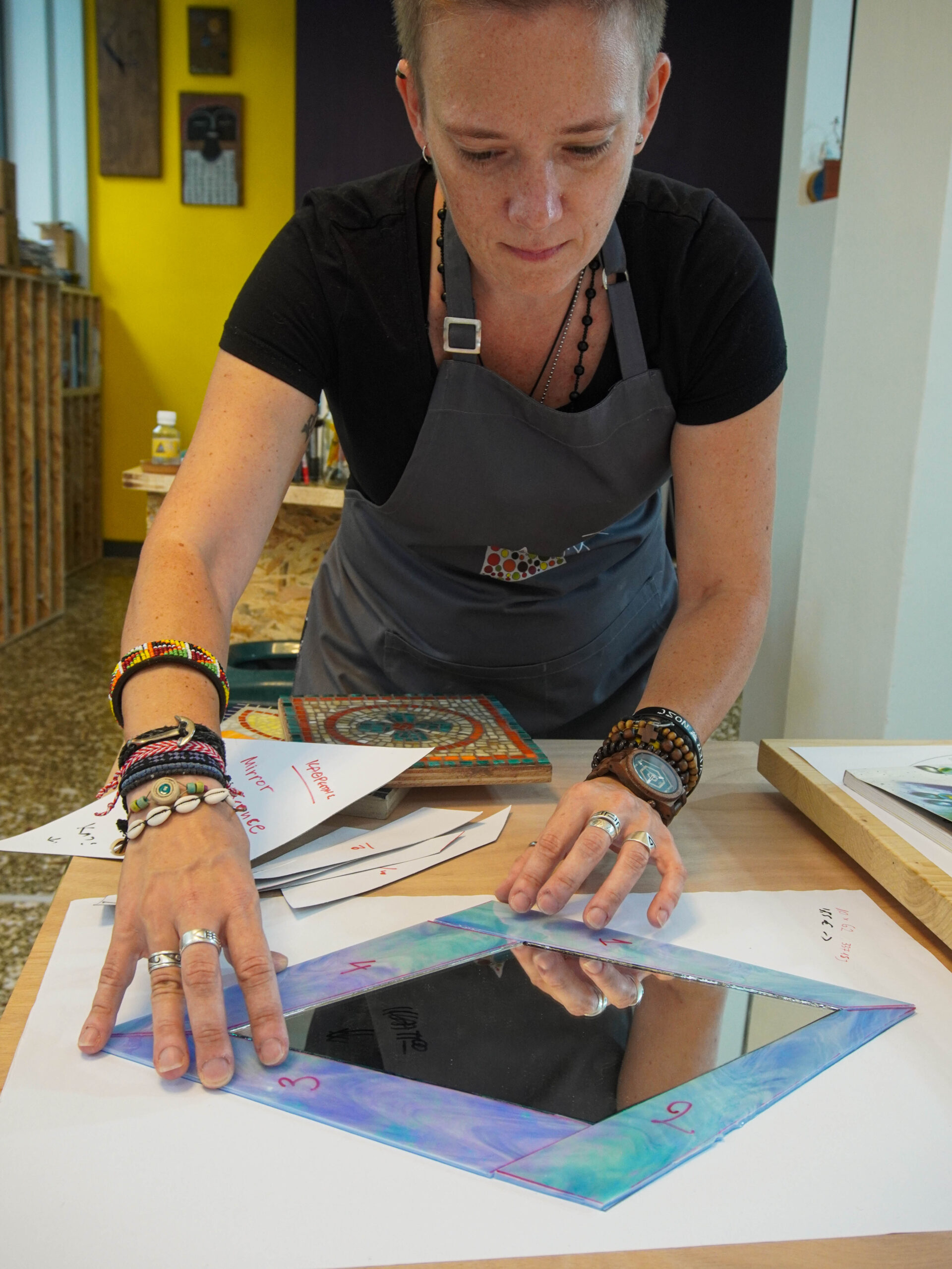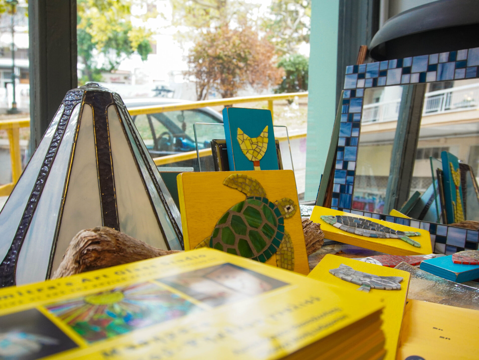 Από κομμάτια γυαλιού με ιριδίζοντα χρώματα, άλλα πιο χοντρά, άλλα πιο λεπτά, μοναδικές ψηφίδες σε ό,τι χρώμα και και σχήμα μπορείς να φανταστείς, οι δύο γυναίκες και οι μαθητές τους φτιάχνουν κοσμήματα, στολίζουν φωτιστικά, γλάστρες και καθρέπτες και δημιουργούν μοναδικά έργα τέχνης πάνω σε πηλό και ξύλο.