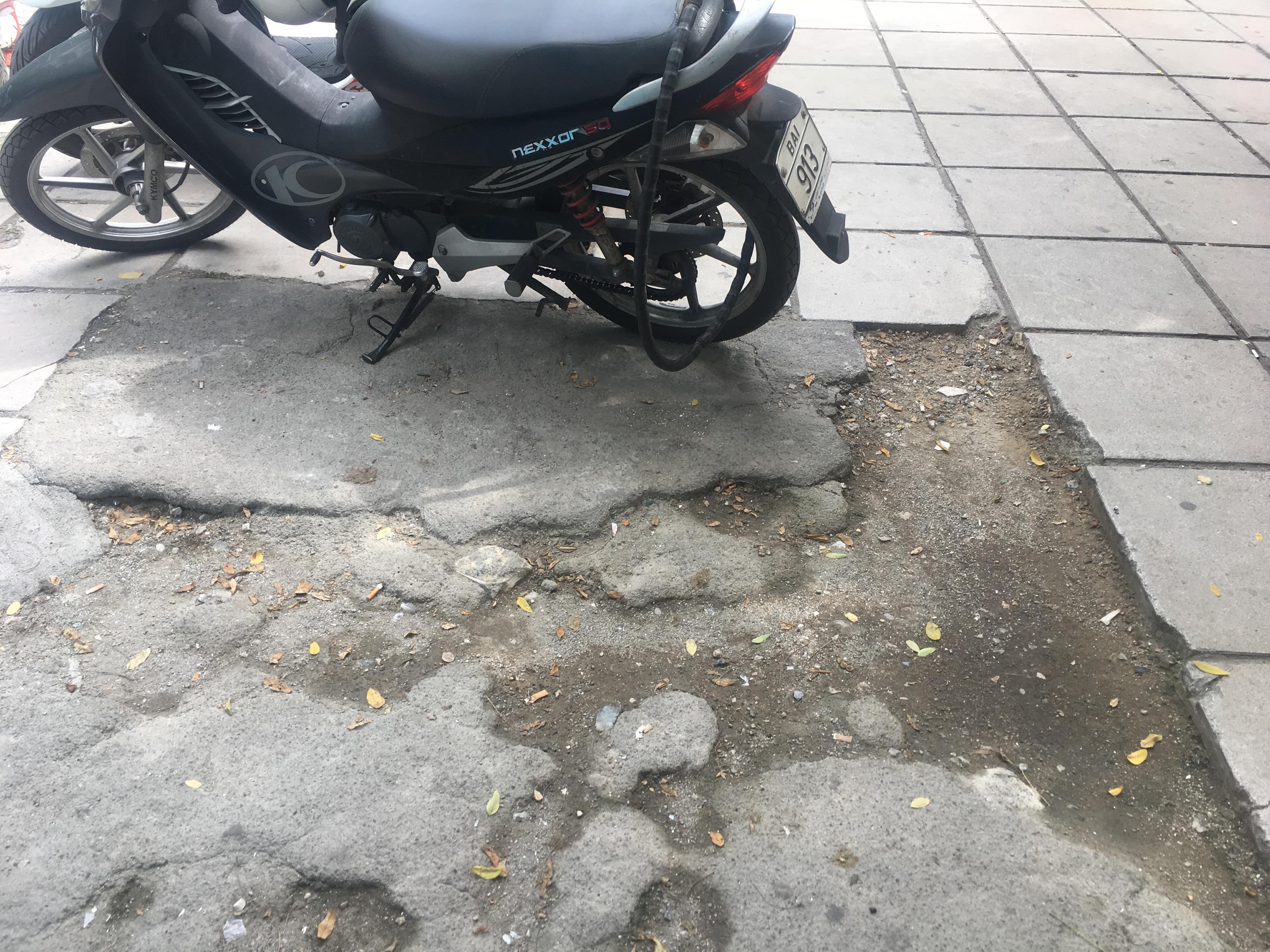 Ο δημόσιος χώρος της πόλης σε εγκατάλειψη. Ένα από τα πιο πολυσύχναστα πεζοδρόμια της πόλης, αυτό της Καρόλου Ντηλ. Μπροστά στο σχολείο. Σπασμένα πλακάκια, παρκαρισμένα μοτοποδήλατα, όγκοι σκουπιδιών, βουλωμένα φρεάτια, παρατημένα παρτέρια χωρίς φυτά. Οι αρμόδιες αντιδημαρχίες προφανώς δεν περπατούν ποτέ εδώ για να βλέπουν όσα συναντούν οι περαστικοί καθημερινά και η κατάσταση χειροτερεύει κάθε μέρα.