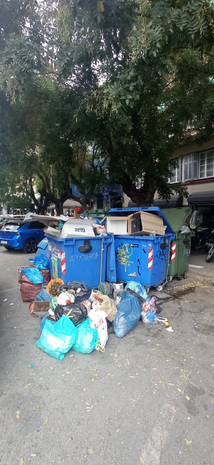 «Η κατάσταση είναι πλέον απερίγραπτη και άκρως επικίνδυνη για τη δημόσια υγεία. Πρόκειται για έξι (6) κάδους (τρεις οργανικών απορριμμάτων, δύο ανακύκλωσης και έναν γυαλιού), οι οποίοι βρίσκονται επί της οδού Ολύμπου, αρ. 69. Εξυπηρετούν τρία οικοδομικά τετράγωνα και έξι (6) επιχειρήσεις εστίασης εκ των οποίων η μία είναι 24ωρης λειτουργίας.