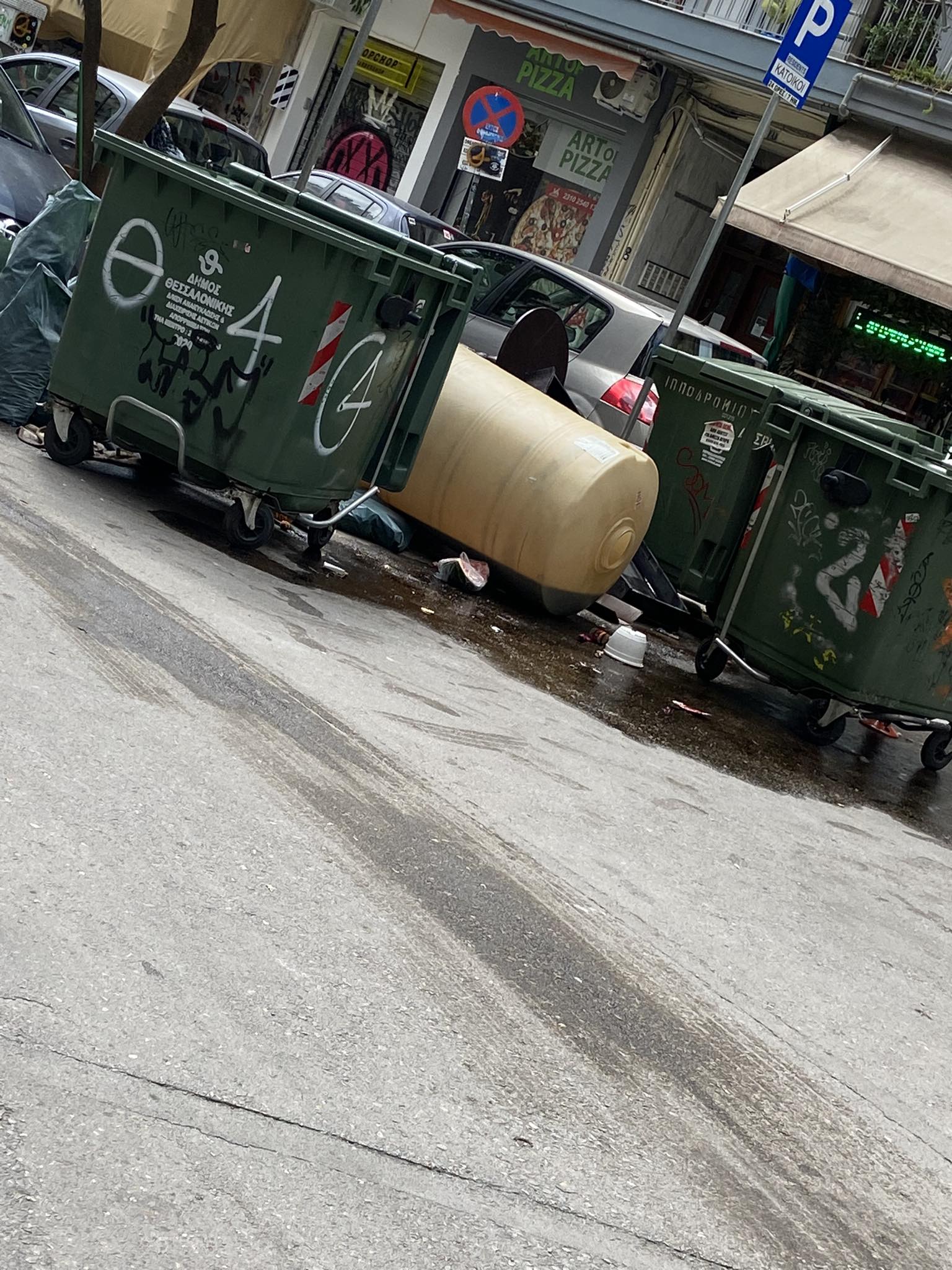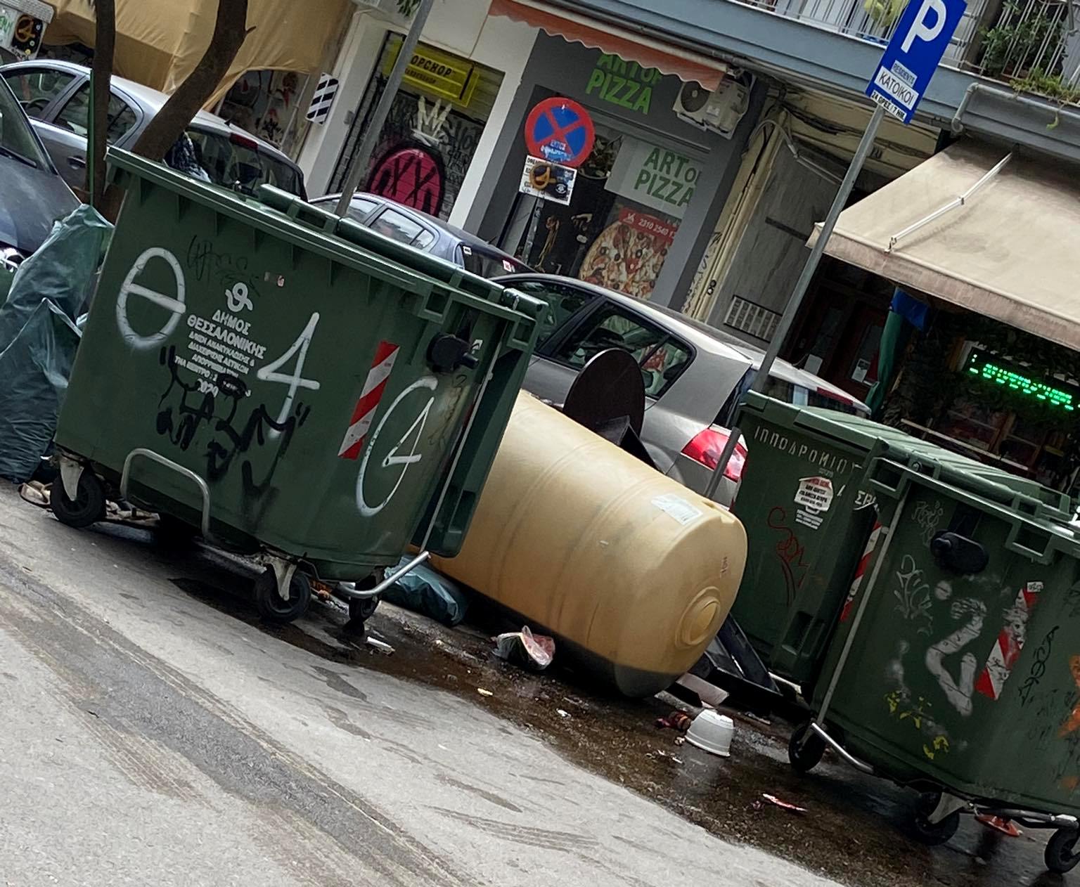 Σήμερα το μεσημέρι διερχόμενη από την οδό Καμβουνίων, αντίκρισα ένα δυσάρεστο και επικίνδυνο θέαμα, παραμονή Δεκαπενταύγουστου. Η οσμή από το πετρέλαιο ήταν έντονη, ήδη κάποια μέτρα μακριά. Έμπροσθεν των οικιακών κάδων απορριμμάτων, κάποιες/οι είχαν εναποθέσει πλαστικές σακούλες με οικοδομικά υλικά (μπάζα) από πρόσφατη ανακαίνιση, βαρέα αντικείμενα και το πιο δυσάρεστων όλων, μια δεξαμενή πετρελαίου, γεμάτη με το εύφλεκτο υγρό, η οποία περιχύθηκε πέριξ των κάδων.