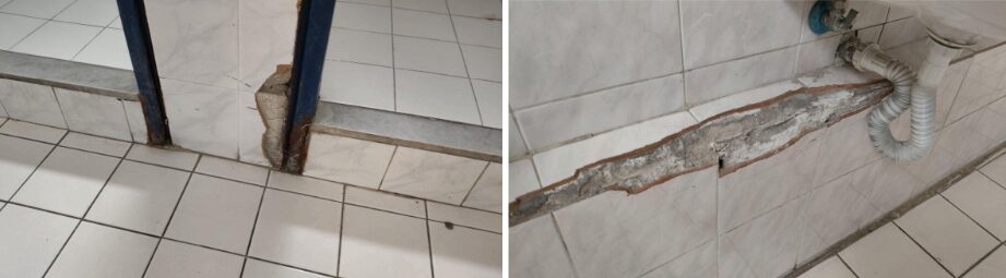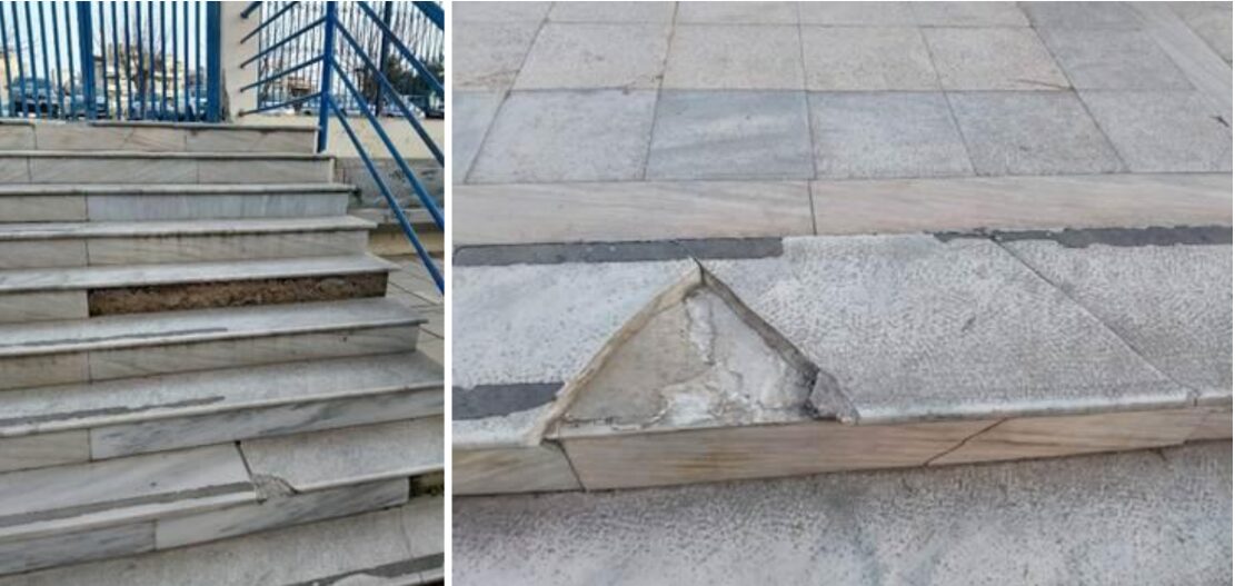 - Άμεση και πλήρη αποκατάσταση όλων των ζημιών που καταγράφονται στην αυλή, από σπασμένα πλακίδια, επικίνδυνα σκουριασμένα σίδερα, αφύλακτες τρύπες στους υπονόμους, διαλυμένες σχάρες κλπ. Το σκέπαστρο στη ράμπα της εισόδου έχει σπάσει σε πολλά σημεία από την κακοκαιρία αρχές Δεκεμβρίου και υπάρχει κίνδυνος να πέσει και να προκαλέσει ατύχημα.