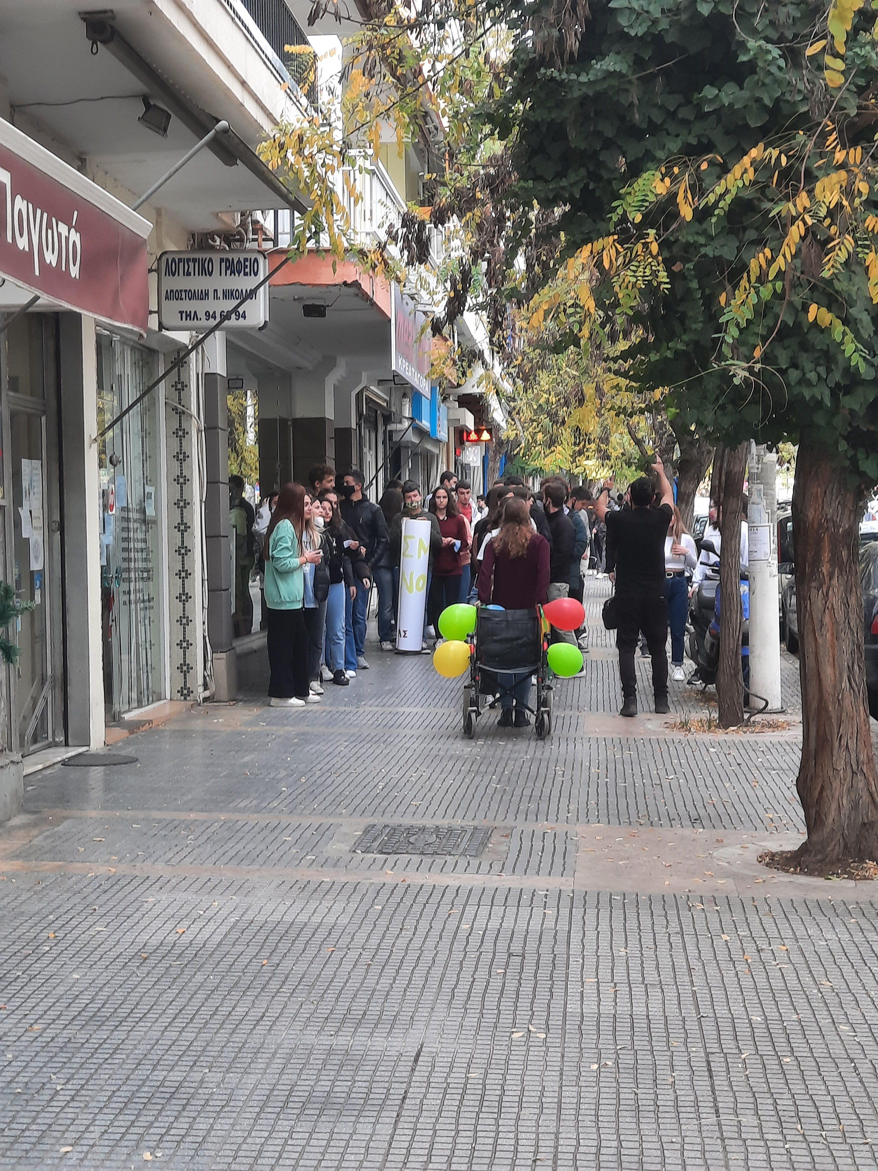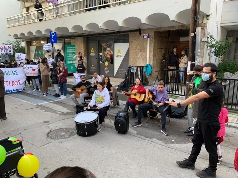 Τα γύρω στενά ξεχείλισαν από νέους ανθρώπους που μαζεύτηκαν έξω από την πόρτα του Σωματείου με έναν τρόπο κινηματογραφικό σαν μήνυμα ότι την παγκόσμια ημέρα αναπηρίας όλη η κοινωνία συναντιέται εκεί, υπενθυμίζοντας πως η αναπηρία δεν μας χωρίζει αλλά μας ενώνει.
