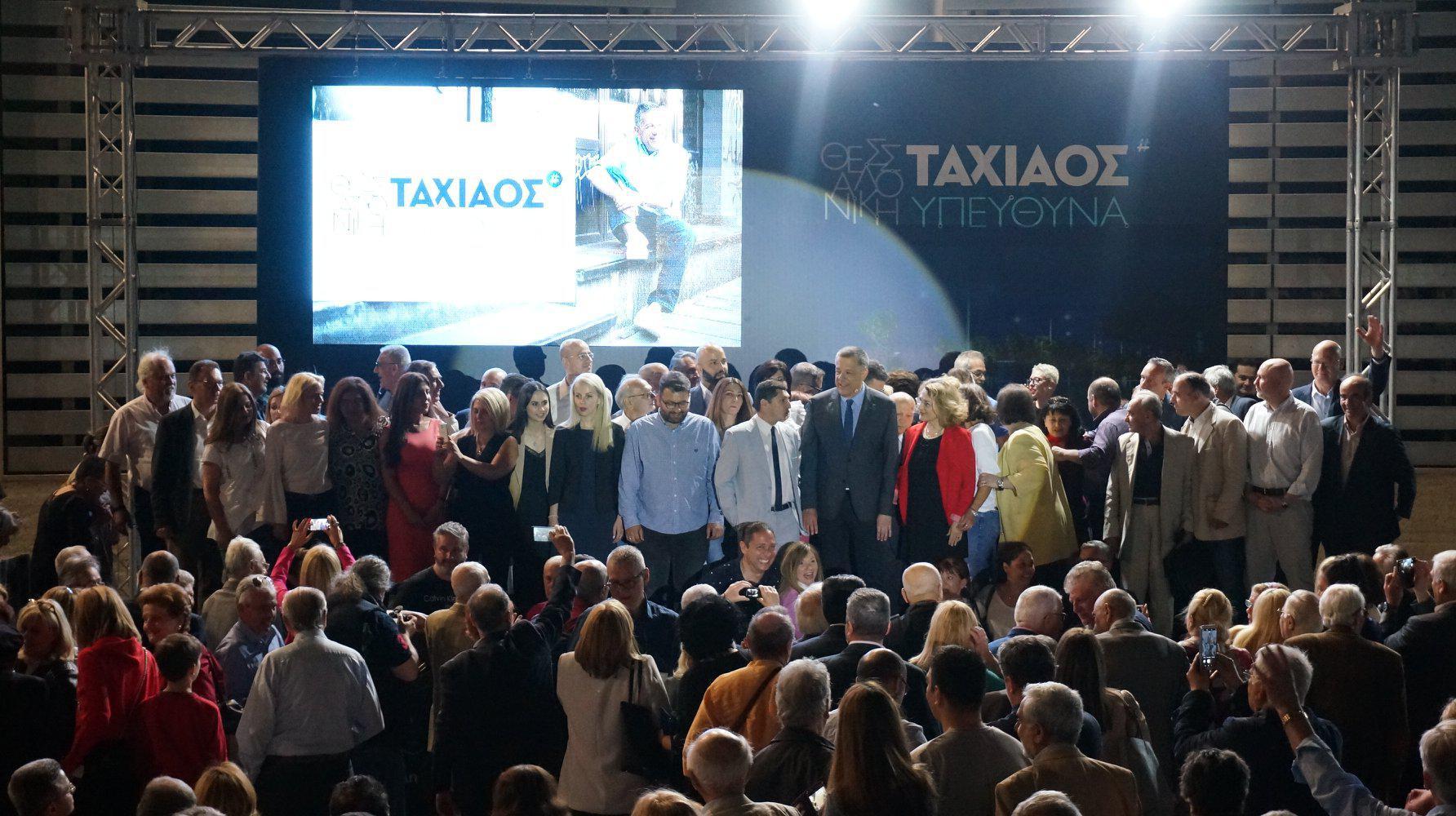 Ο κ. Ταχιάος τόνισε ότι επέλεξε το δημαρχείο της Θεσσαλονίκης για δύο λόγους: γιατί σε αυτό τον χώρο θέλει η παράταξη του να διοικήσει, να στεγάσει το όραμα και το σχέδιό της για τη Θεσσαλονίκη, αλλά και γιατί πρέπει «να μάθουμε να κάνουμε τις συγκεντρώσεις πολιτισμένα χωρίς να κλείνουμε την πόλη». Άσκησε δε, κριτική για το γεγονός, ότι με αφορμή την ομιλία του πρωθυπουργού στο λιμάνι, κεντρικοί δρόμοι της πόλης ήταν κλειστοί.