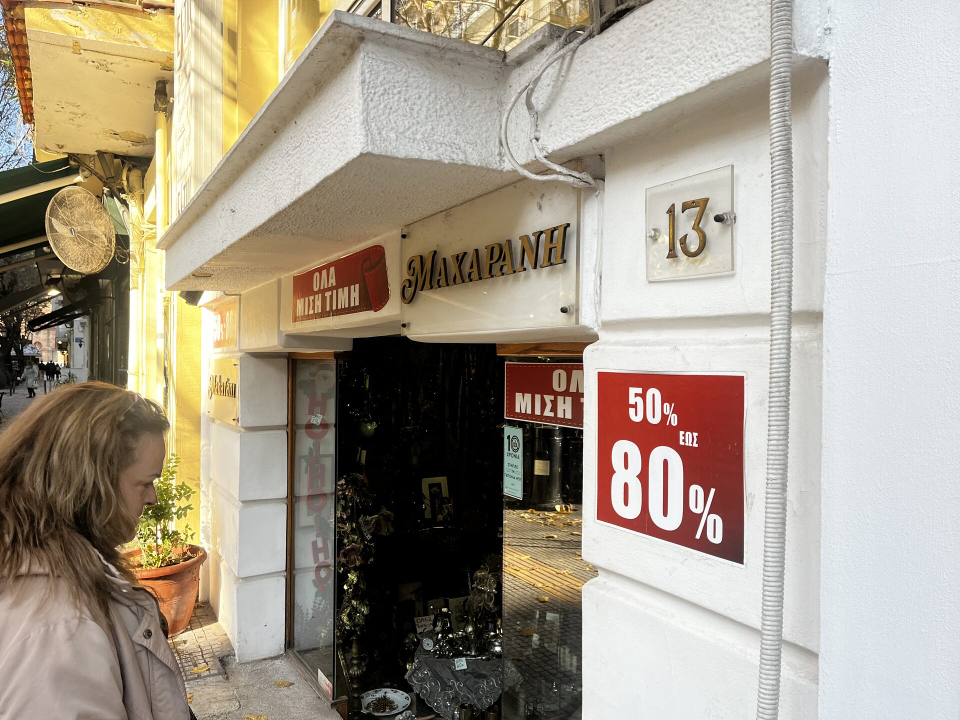«ΟΛΑ ΜΙΣΗ ΤΙΜΗ» φωνάζει το αυτοκόλλητο που είναι κολλημένο έξω από ένα μαγαζί με είδη διακόσμησης σπιτιού στην Αλ. Σβώλου, με την ελπίδα ο κόσμος να μπει μέσα.