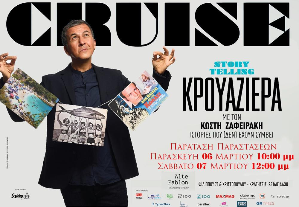 Η υπέροχη διαφορετική «Κρουαζιέρα» που μας έχει ετοιμάσει επιμελώς ο απολαυστικός Κωστής Ζαφειράκης, παίρνει παράταση παραστάσεων και σας υποδέχεται την Παρασκευή 6 και το Σάββατο 7 Μαρτίου στο Alte Fablon!