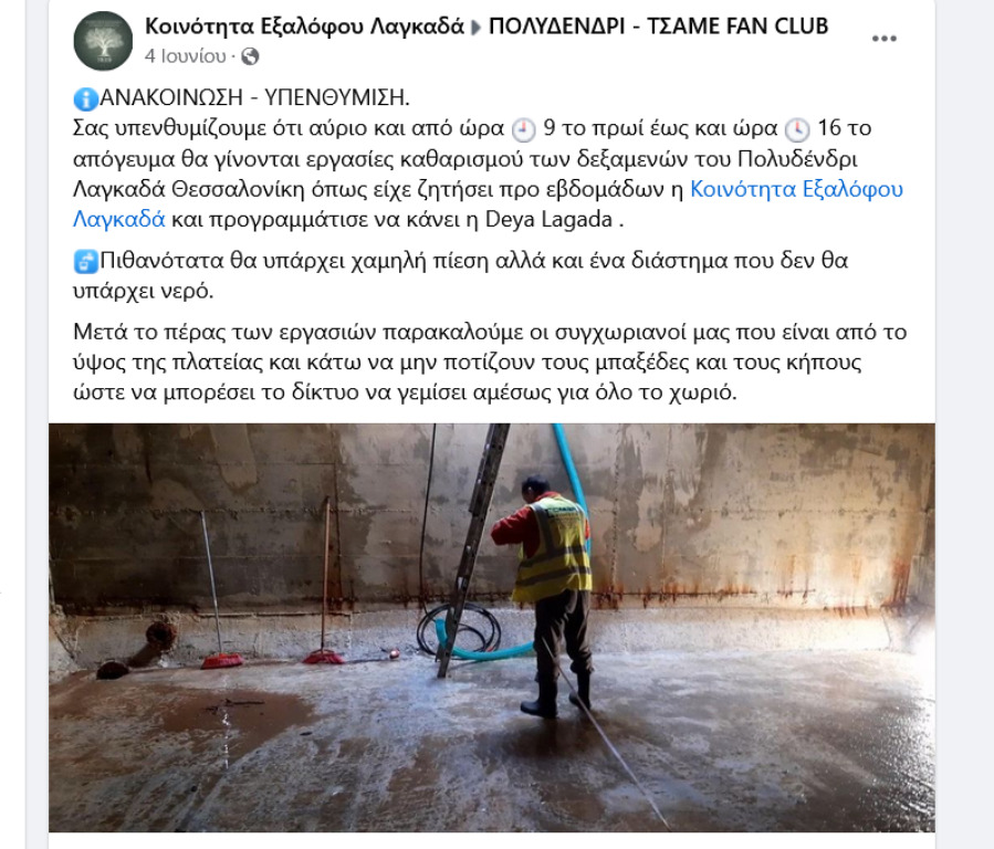 Λόγω έλλειψης συντήρησης το σύστημα της υδροδότησης έχει υποστεί βλάβες και τα συνεργεία της ΔΕΥΑ Λαγκαδά προσπαθούν να το επαναφέρουν σε λειτουργία.