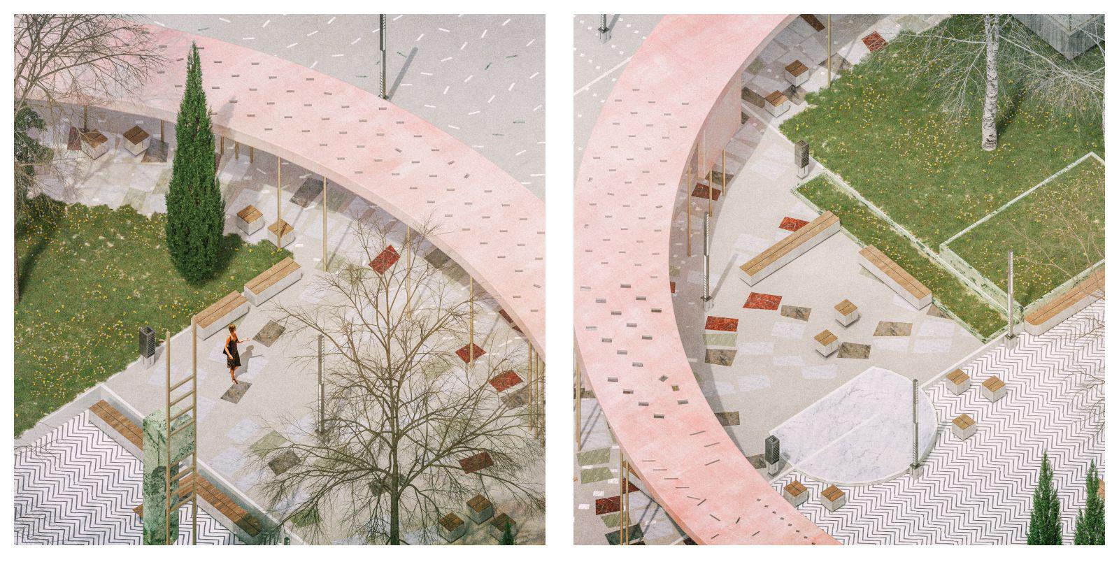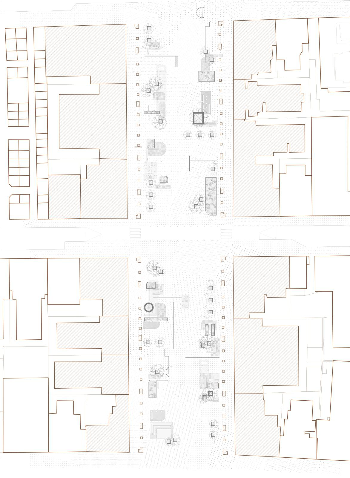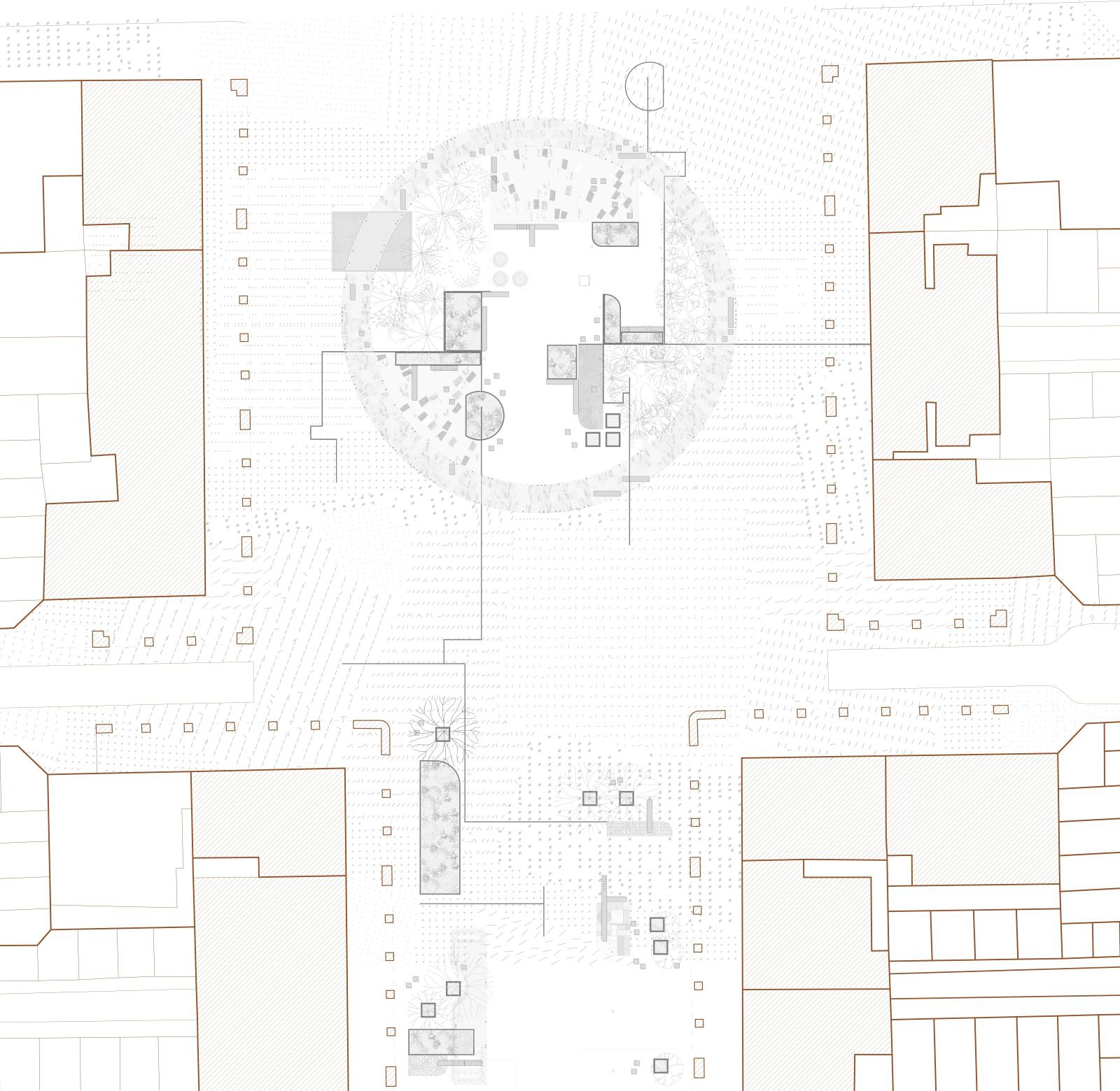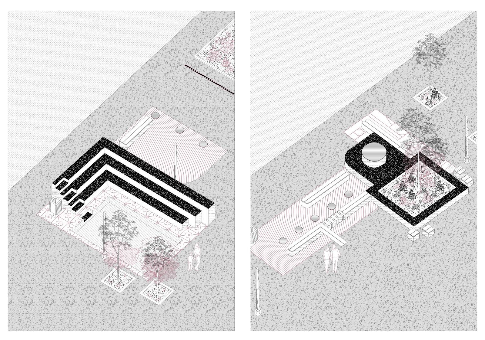 Ο κήπος / Το έξω-μέσα Τέλος, στο πάνω άκρο του άξονα βρίσκουμε μία συνθήκη που προσπαθεί να ξεφύγει από τον αστικό χαρακτήρα της υπόλοιπης πρότασης. Ένας κυκλικός, εσωστρεφής κήπος με έντονη φύτευση, υπενθυμίζει την ύπαρξη του φυσικού στοιχείου μέσα στην αστικότητα του άξονα. Παράλληλα δημιουργεί μία σχέση αντίστιξης με την τετράγωνη πλατεία στο κάτω άκρο της επέμβασης. Από τη μία ο κύκλος που στρέφετε προς το εσωτερικό του, περικλείει το πράσινο και αφήνει τον έξω χώρο σχεδόν άδειο και κενό – φέρνει κατά μία έννοια το έξω-μέσα. Από την άλλη το τετράγωνο, κενό στο εσωτερικό του που αφήνει το φυσικό στοιχείο εκτός του να το περιβάλει. Σηματοδοτούν και τα δύο την αρχή και το τέλος μίας κίνησης και μίας πορείας, μόνο που οι θέσεις αυτές, της αφετηρίας και του τερματισμού, μπορούν να εναλλάσσονται.