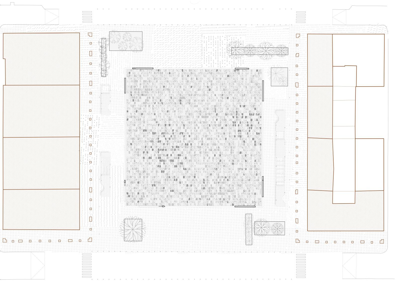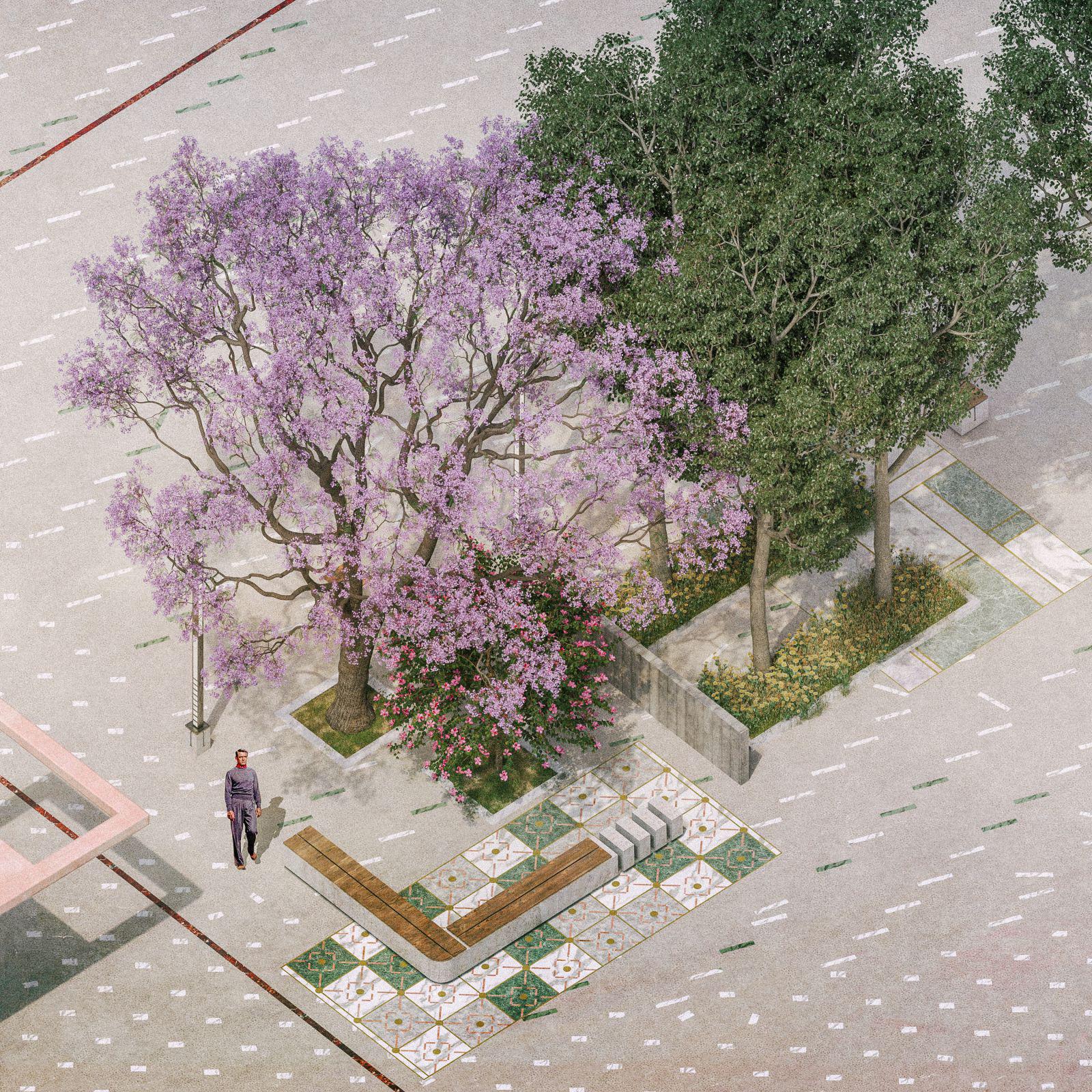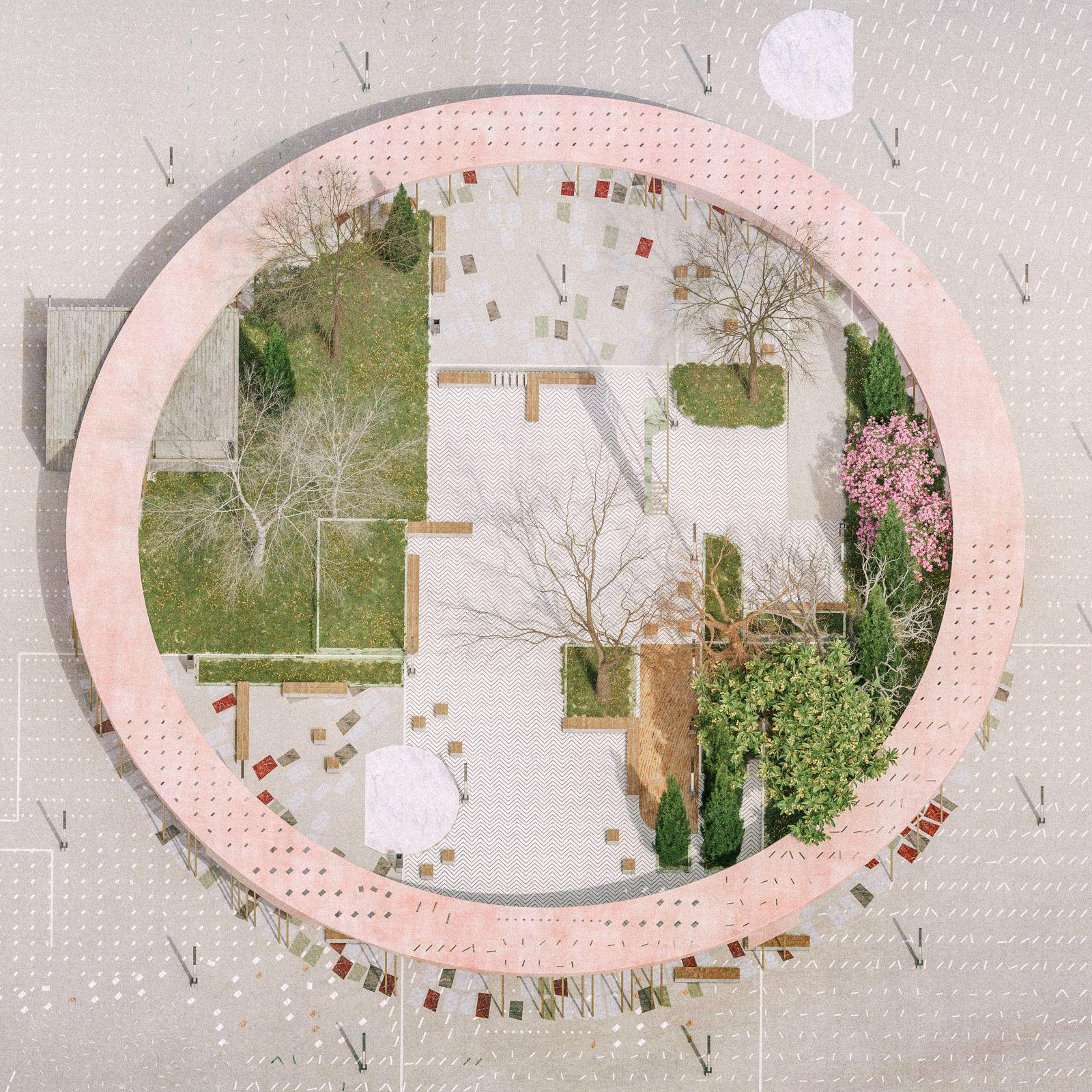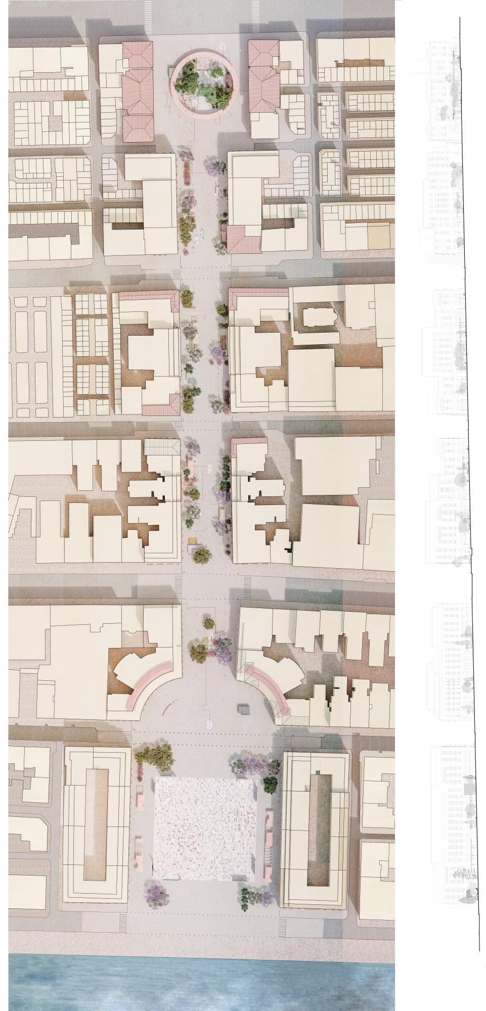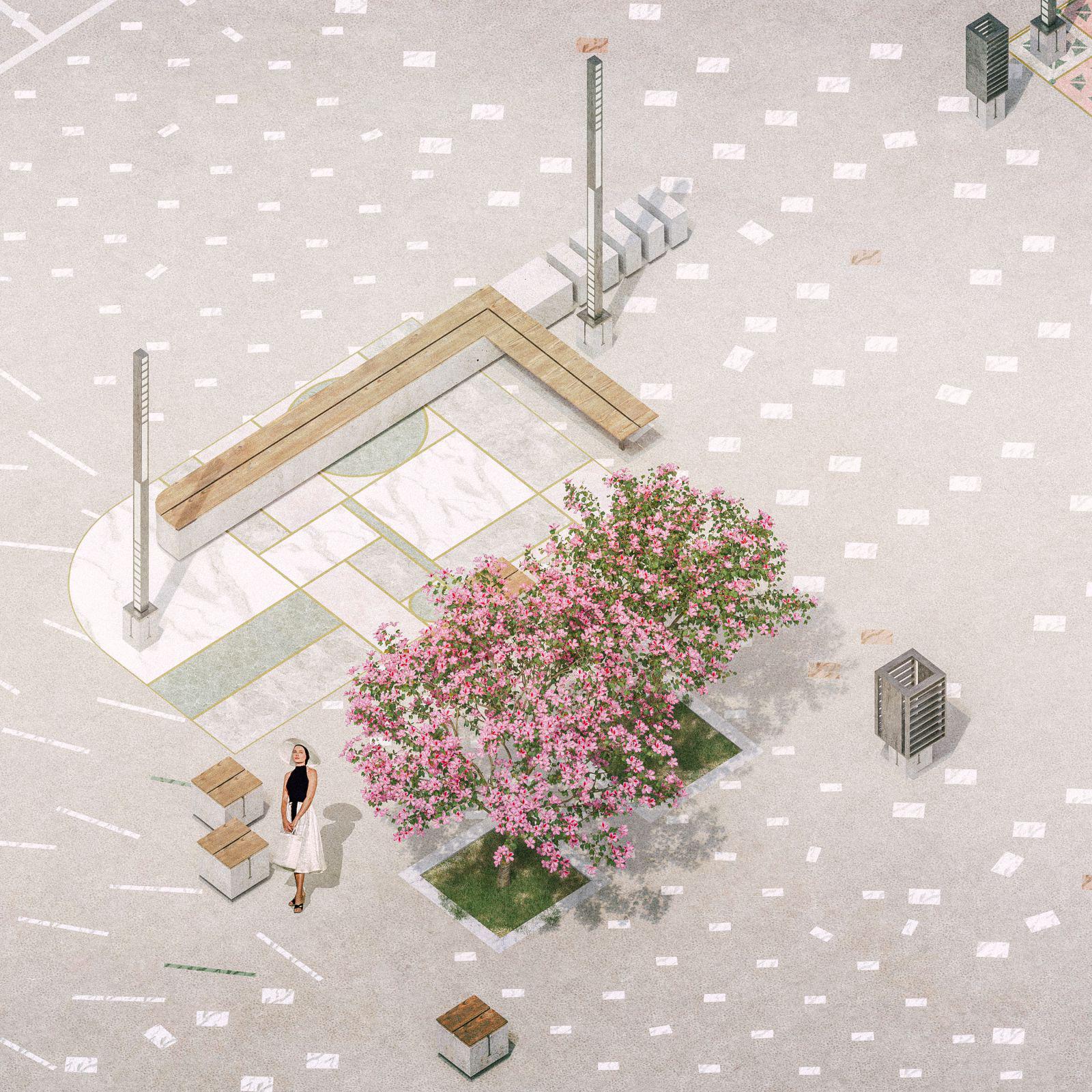 Ο κήπος / Το έξω-μέσα Τέλος, στο πάνω άκρο του άξονα βρίσκουμε μία συνθήκη που προσπαθεί να ξεφύγει από τον αστικό χαρακτήρα της υπόλοιπης πρότασης. Ένας κυκλικός, εσωστρεφής κήπος με έντονη φύτευση, υπενθυμίζει την ύπαρξη του φυσικού στοιχείου μέσα στην αστικότητα του άξονα. Παράλληλα δημιουργεί μία σχέση αντίστιξης με την τετράγωνη πλατεία στο κάτω άκρο της επέμβασης. Από τη μία ο κύκλος που στρέφετε προς το εσωτερικό του, περικλείει το πράσινο και αφήνει τον έξω χώρο σχεδόν άδειο και κενό – φέρνει κατά μία έννοια το έξω-μέσα. Από την άλλη το τετράγωνο, κενό στο εσωτερικό του που αφήνει το φυσικό στοιχείο εκτός του να το περιβάλει. Σηματοδοτούν και τα δύο την αρχή και το τέλος μίας κίνησης και μίας πορείας, μόνο που οι θέσεις αυτές, της αφετηρίας και του τερματισμού, μπορούν να εναλλάσσονται.