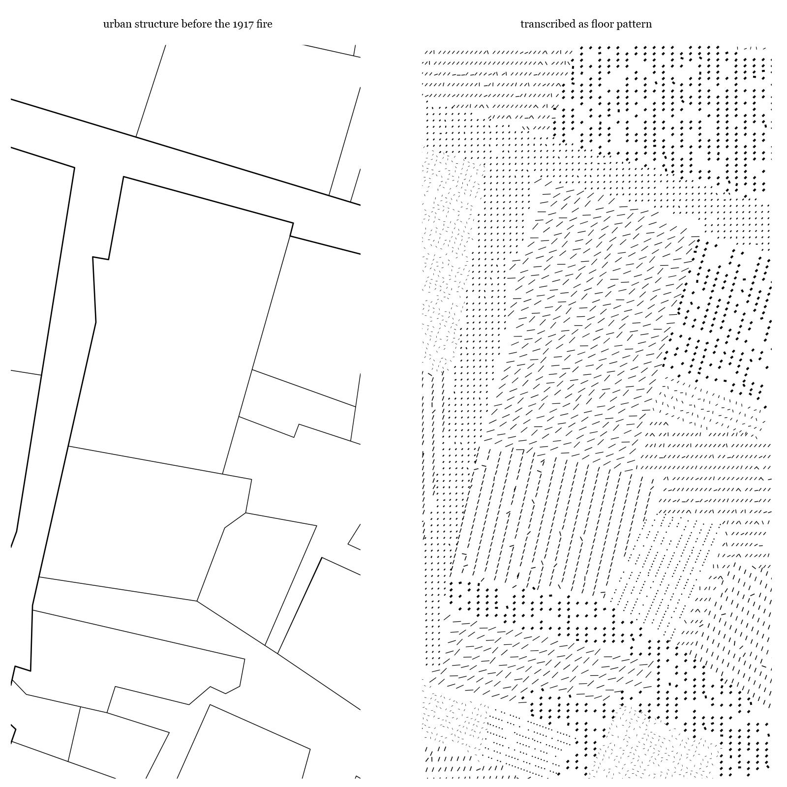 Στο ενιαίο χυτό δάπεδο λοιπόν, προστίθενται ένθετα γραμμικά μαρμάρινα στοιχεία σε διάφορα μεγέθη και διαφορετικές κλίσεις. Η διαφοροποίηση των ένθετων στοιχείων συμβαίνει ομοιότροπα μέσα στο νοητό χώρο των διαφορετικών τετραγώνων και δρόμων που παλιού ιστού, με αποτέλεσμα το συνολικό pattern να σχηματίζει αφαιρετικά τον προ του 1917 ιστό. Η επιφάνεια λοιπόν φορτίζεται από το ιστορικό παρελθόν και επαναφέρει συμβολικά αυτό που η αρχική χάραξη της Αριστοτέλους είχε σβήσει.