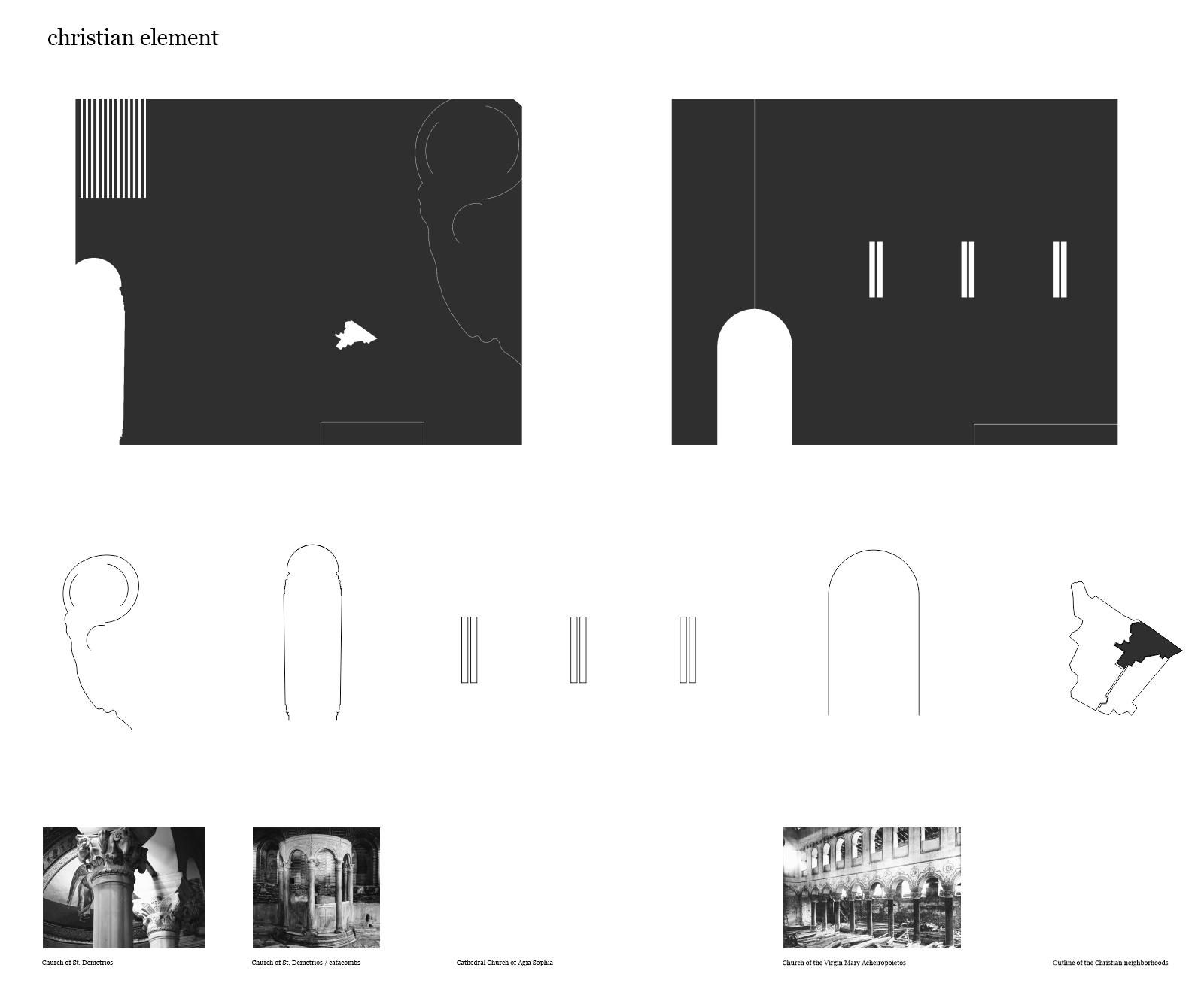 Παράλληλα συνεχίζουν να αναφέρονται στην πόλη και το παρελθόν της: Τα δάπεδα, τα μοτίβα και τα χρώματά τους αποτελούν μεταγραφή διαφορετικών αρχιτεκτονικών στοιχειών από τα διάφορα αρχιτεκτονικά μνημεία της πόλης. Τσιμεντοπλακίδια που παραπέμπουν στα μοτίβα της τοιχοποιίας των «Λουτρών ο Παράδεισος». Κεραμικά δάπεδα που αποτελούν θραύσματα της δομής της οροφής της Ροτόντας. Πλακόστρωτα που έχουν τις ρίζες τους στα δάπεδα του γαλεριανού συγκροτήματος.