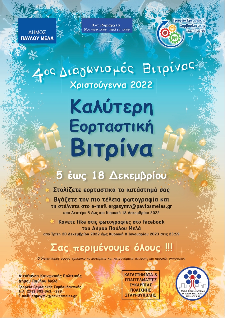 Ο Δήμος Παύλου Μελά και η Αντιδημαρχία Κοινωνικής Πολιτικής διοργανώνουν τον 4ο Διαγωνισμό Βιτρίνας και Πρόσοψης Καταστημάτων με τίτλο: «Καλύτερη Εορταστική Βιτρίνα : ΧΡΙΣΤΟΥΓΕΝΝΑ 2022».