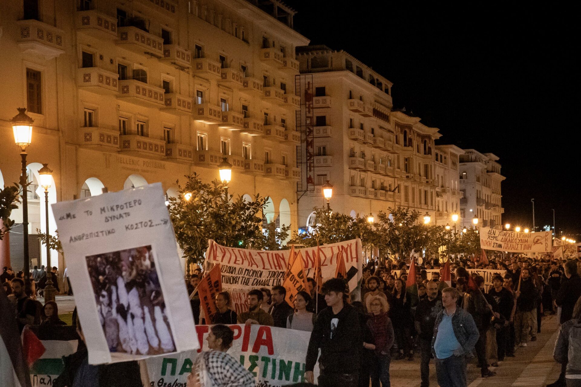 Πορεία πραγματοποιήθηκε το βράδυ της Πέμπτης στο κέντρο της Θεσσαλονίκης με μέλη της εξωκοινοβουλευτικής Αριστεράς και Παλαιστίνιους που ζουν στην πόλη να εκφράζουν την οργή τους για τα όσα συμβαίνουν στη Γάζα.