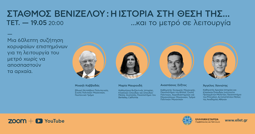 Η Ελληνική Εταιρία Περιβάλλοντος και Πολιτισμού διοργανώνει online συζήτηση με θέμα: «Σταθμός Βενιζέλου: Η ιστορία στη θέση της… και το μετρό σε λειτουργία», σήμερα Τετάρτη 19/5 στις 20:00.