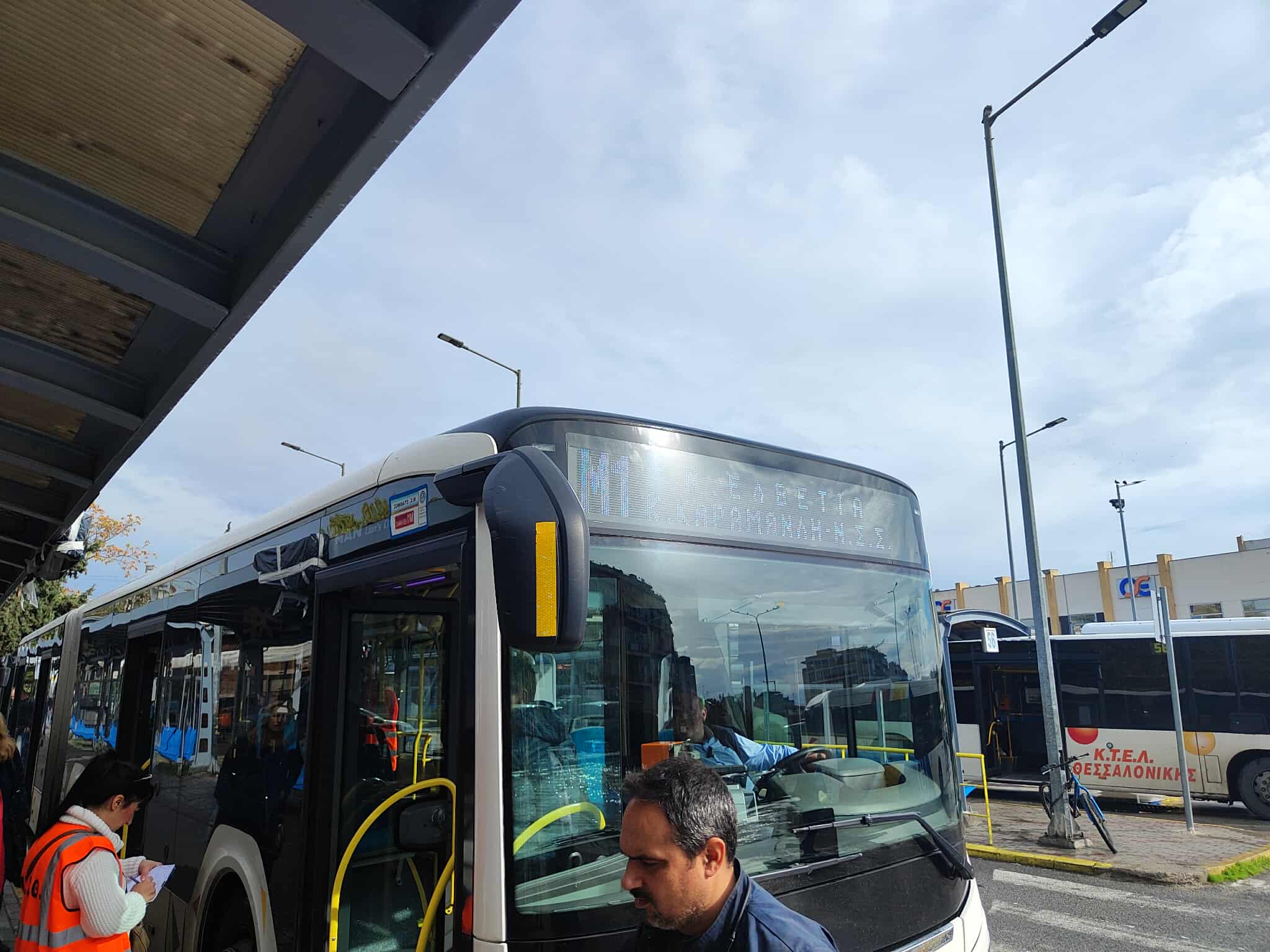 Το πρωί της Δευτέρας λίγο μετά τις 11:00 βρεθήκαμε στο Ν.Σ.Σ προκειμένου να επιβιβαστούμε σε ένα από τα λεωφορεία της γραμμής Μ1 που έκανε από νωρίς τα παρθενικά της δρομολόγια στους δρόμους της Θεσσαλονίκης.