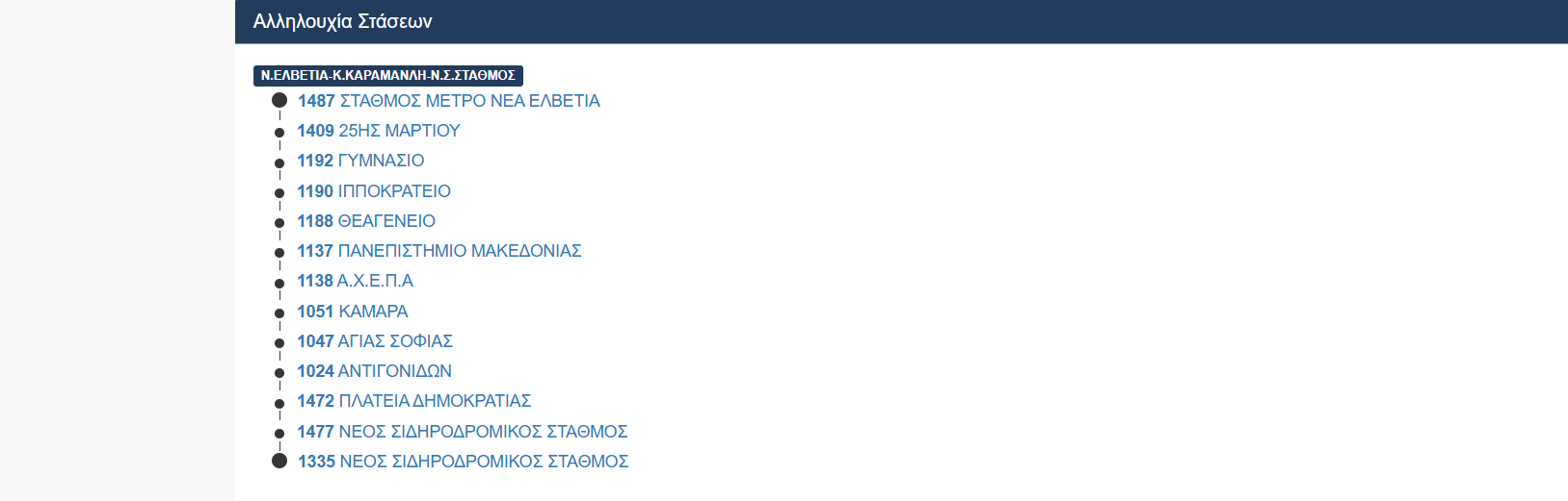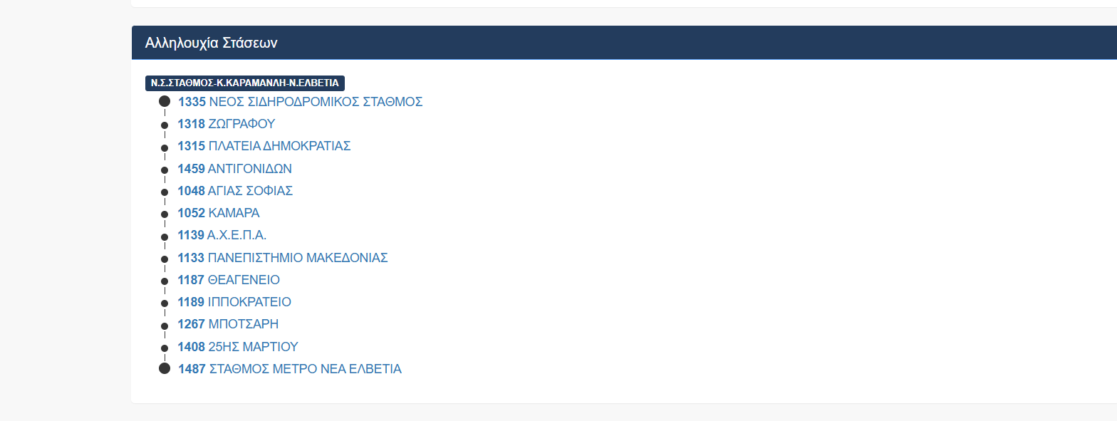 Μετάβαση: Σταθμός Μετεπιβίβασης Ν. Ελβετίας, Μιχ. Ψελλού, δεξιόστροφος ελιγμός στην παράπλευρη Ε.Ο. Θεσσαλονίκης- Ν. Μουδανίων, Λεωφ. Κωνσταντίνου Καραμανλή, Εγνατία, Μοναστηρίου, Νέος Σιδηροδρομικός Σταθμός.