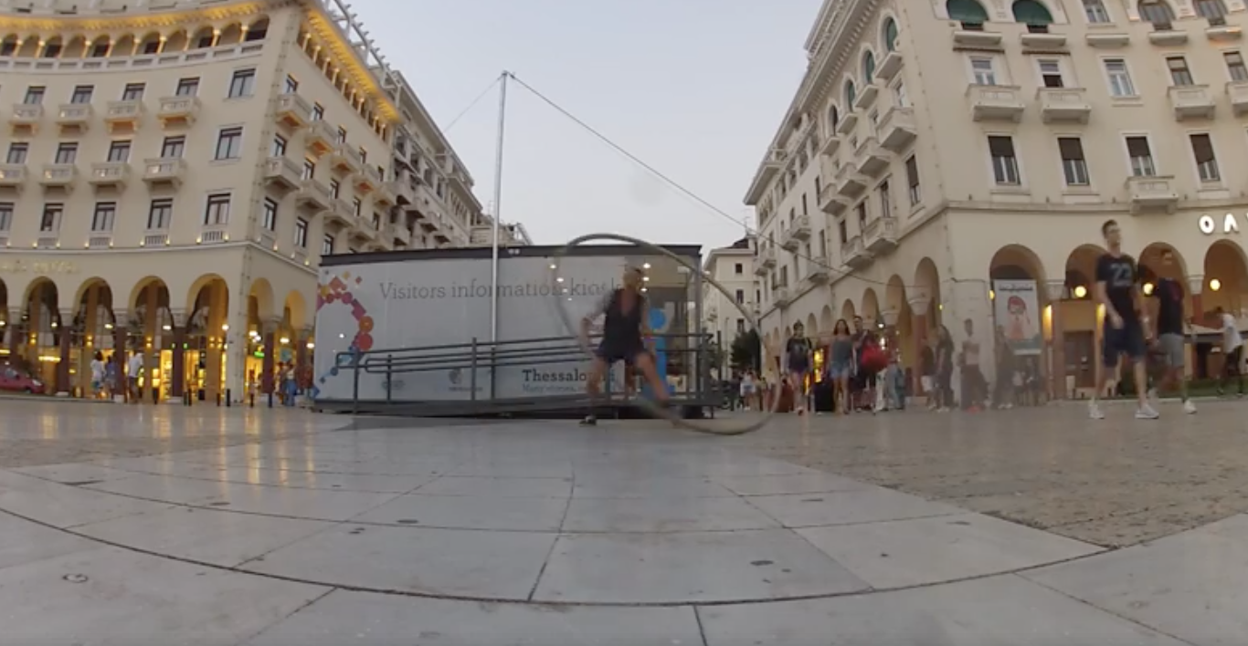 Απόγευμα στην Αριστοτέλους. Οι περαστικοί βλέπουν το σώου του Κωνσταντίνου Κωνσταντινίδη από τους kykloscyrwheels και για λίγο η πόλη γίνεται σκηνικό ονείρου.