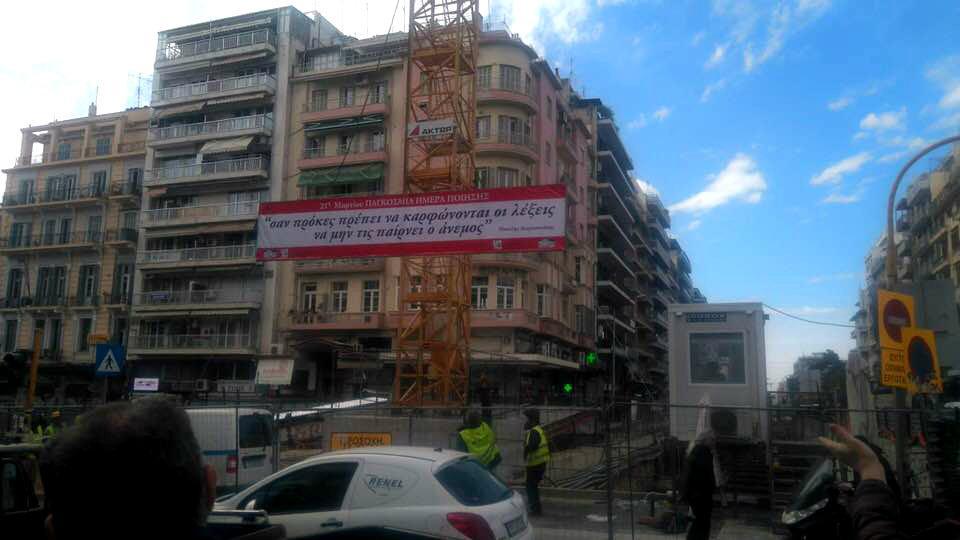 Στον ουρανό της πόλης υψώθηκε το πανό μήκους 8 μέτρων και πλάτους 1.30 που αναρτήθηκε στον γερανό του Μετρό στο εργοτάξιο της Αγίας Σοφίας. Με αφορμή την σημερινή Παγκόσμια Ημέρα Ποίησης, ο εμβληματικός στίχος του Μανόλη Αναγνωστάκη «σαν πρόκες πρέπει να καρφώνονται οι λέξεις να μην τις παίρνει ο άνεμος…» μας καλεί να υψώσουμε το βλέμμα και να θυμηθούμε το έργο του σπουδαίου ποιητή.