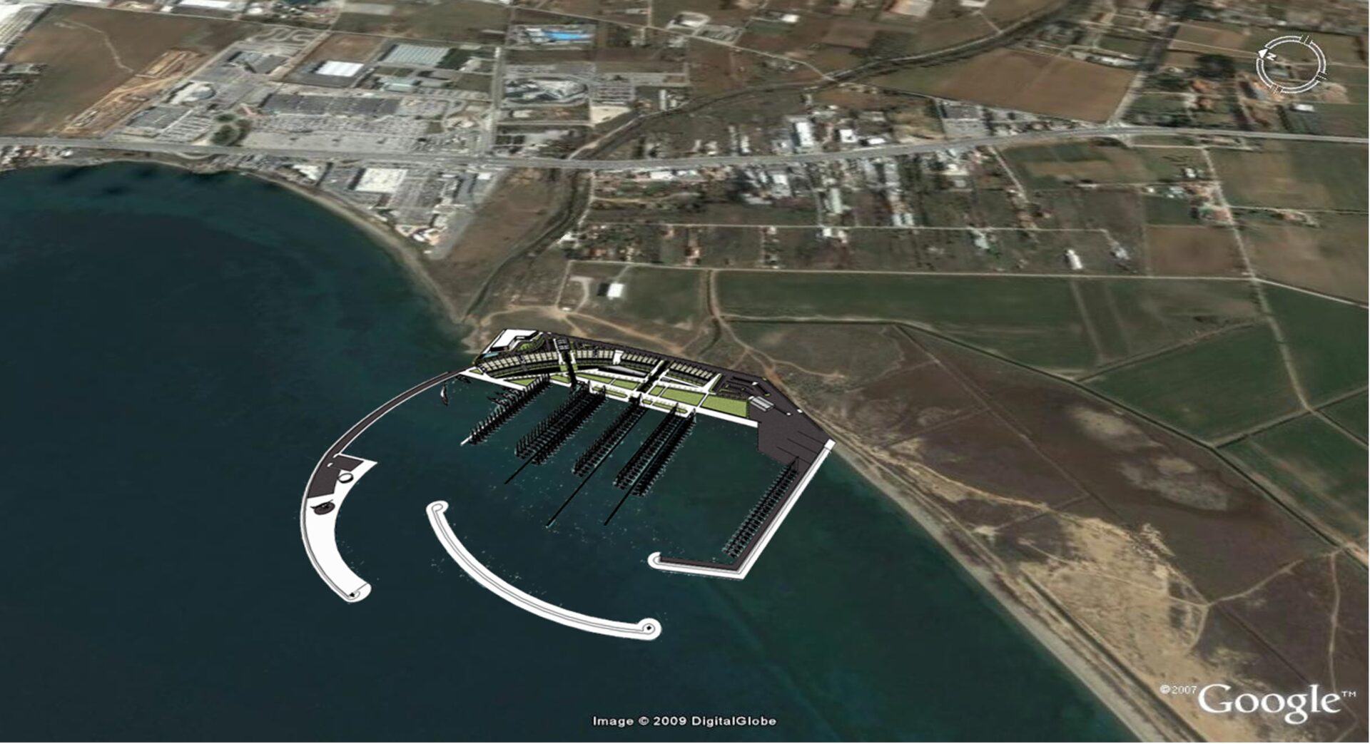 Σχεδιάστηκε να διαθέτει κυματοθραύστη και 3 πλωτούς προβλήτες, σε θαλάσσια ζώνη συνολικού εμβαδού 127.780 τ.μ.