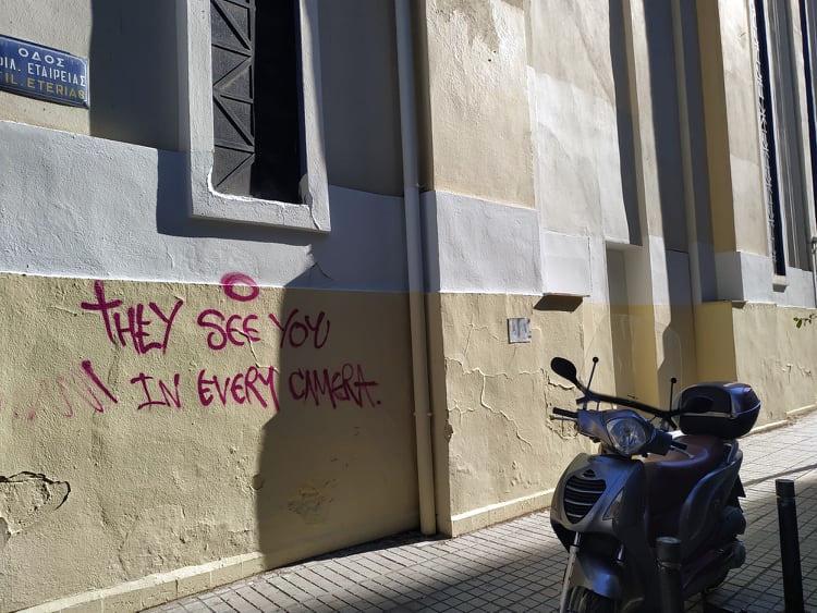 Οδός φιλικής εταιρείας 24. Οι εργασίες για το βάψιμο της Μασονικής στοάς μόλις έχουν ολοκληρωθεί. Το κτίριο μοιάζει η μάλλον έμοιαζε καινούριο. Την επόμενη κι ολας μέρα τα πρώτα στοιχειά βανδαλισμού έκαναν την εμφάνιση τους. «They see you in every camera». Γιατί τι μένει άλλωστε «όρθιο» σε αυτήν την πόλη για να μείνει και αυτό;