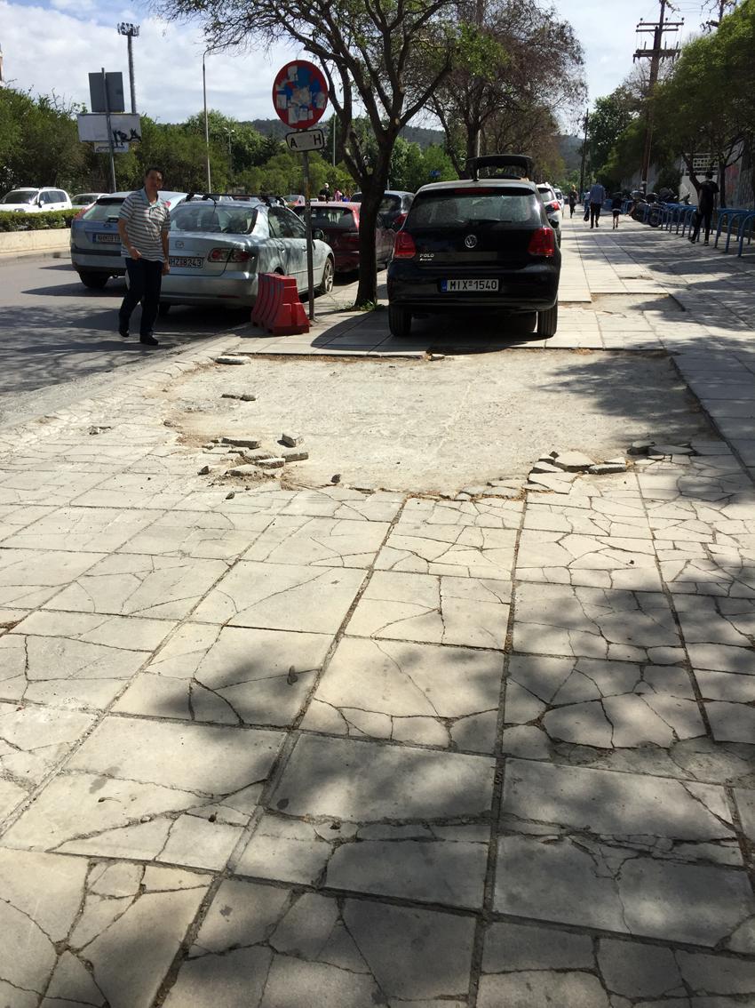 Κατεστραμμένο και με διπλή χρήση, επιβαρυμένη ιδιαίτερα τα Σαββατοκύριακα. Βαθμός επικινδυνότητας 10 για κάθε χρήστη είτε του δρόμου είτε του πεζοδρομίου.