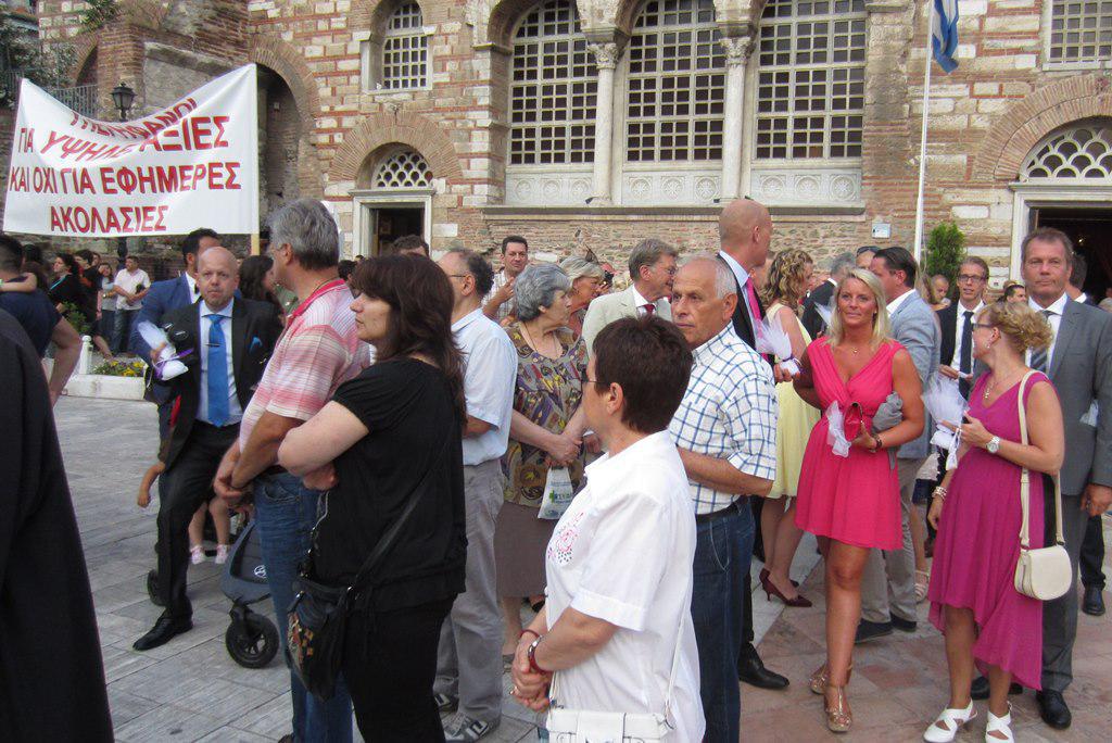 Χτες στο προάυλιο του Άι Δημήτρη, οι κατηχητικές οργανώσεις διαμαρτυρήθηκαν εντόνως για το γνωστό θέμα… Αυτό βέβαια δεν ήταν λόγος να μη γίνουν και οι προγραμματισμένοι γάμοι. Το αμήχανο ζευγάρι της φωτογραφίας μάλλον συνειδητοποίησε ότι δεν ήταν και πολύ καλή η επιλογή της μέρας. Δεν πειράζει στις γαμήλιες φωτογραφίες τους θα μπορούν να λένε ότι στο γάμο τους έγινε χαμός. Είμαι περίεργη ποιος έπιασε την ανθοδέσμη.