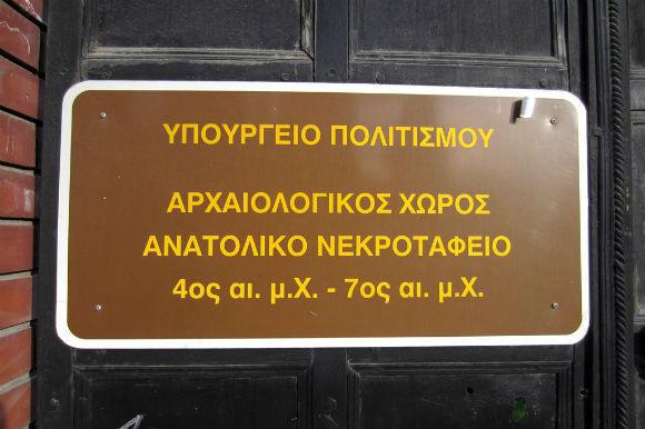 Αυτός ο περιφραγμένος καταπράσινος χώρος κολλητά με τον αυλόγυρο του Νοσοκομείου Άγιος Δημήτριος περικλείει ό,τι έχει απομείνει από το παλαιοχριστιανικό ανατολικό νεκροταφείο. Η γη της Θεσσαλονίκης είναι γεμάτη από πολυάριθμα νεκροταφεία όπου ενταφιάστηκαν Ορθόδοξοι, Εβραίοι, Αρμένιοι και Μουσουλμάνοι Από την Καμάρα και νότια της οδού Εγνατίας έθαβαν τους νεκρούς τους οι Μουσουλμάνοι, βόρεια της Εγνατίας οι Εβραίοι και ανατολικά της Καμάρας οι Χριστιανοί. Το υπέδαφος της πόλης, όμως, φιλοξενεί ταφικά συμπλέγματα πολύ παλαιότερα σε χρονολογίες. Παρόλο που δεν γνωρίζουμε πολλά για τους χώρους των κοιμητηρίων πριν από το 19ο αιώνα, σε ανασκαφή που έγινε στις εγκαταστάσεις της Διεθνούς Έκθεσης Θεσσαλονίκης, η ΙΣΤ’ Εφορεία Προϊστορικών και Κλασσικών Αρχαιοτήτων κατέληξε στο συμπέρασμα ότι η περιοχή εντάσσεται στον πυρήνα του αρχαίου ανατολικού νεκροταφείου και αποτελεί ενότητα με την περιοχή της σημερινής πανεπιστημιούπολης. Άλλωστε κατά την αποξήλωση τάφων από το εβραϊκό νεκροταφείο στην πανεπιστημιούπολη, αποκαλύφθηκαν ταφικές πλάκες ρωμαϊκών, βυζαντινών, ελληνιστικών και παλαιοχριστιανικών χρόνων. Ο χώρος είναι άγνωστο αν είναι ανοιχτος στο κοινό. Η πόρτα του είναι κλειστή και δεν υπάρχει κάποιο πινακίδα που να σε πληροφορεί για το αν και πότε είναι επισκέψιμο αλλά ούτε και καμιά άλλη χρήσιμη πληροφορία εκτός από την παρακάτω ταμπέλα πάνω στην κλειστή πόρτα.