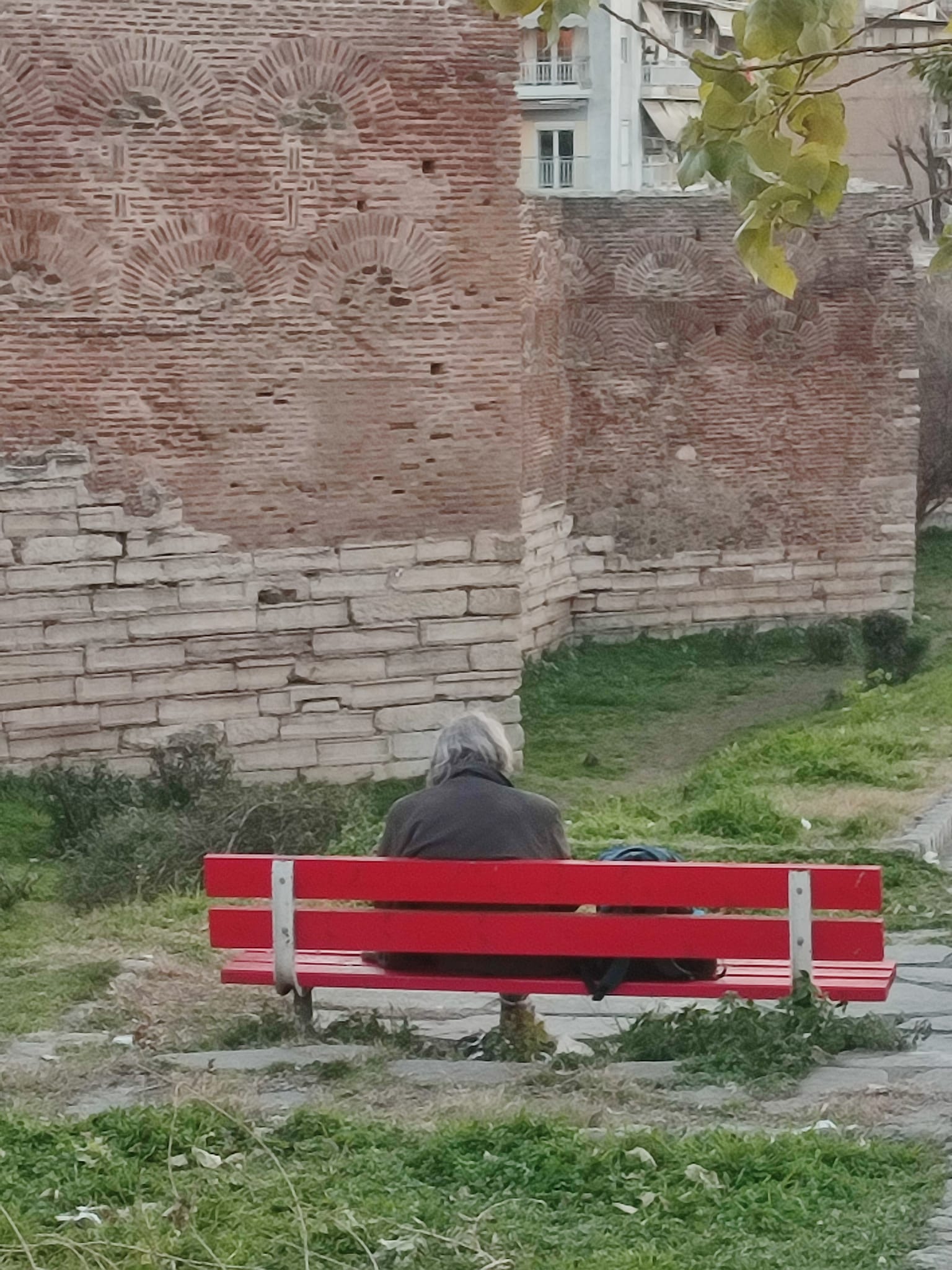 Σκέψεις από μια τυχαία φωτογραφία ενός άνδρα καθισμένου στο κόκκινο παγκάκι των Δυτικών τειχών στη Θεσσαλονίκη.