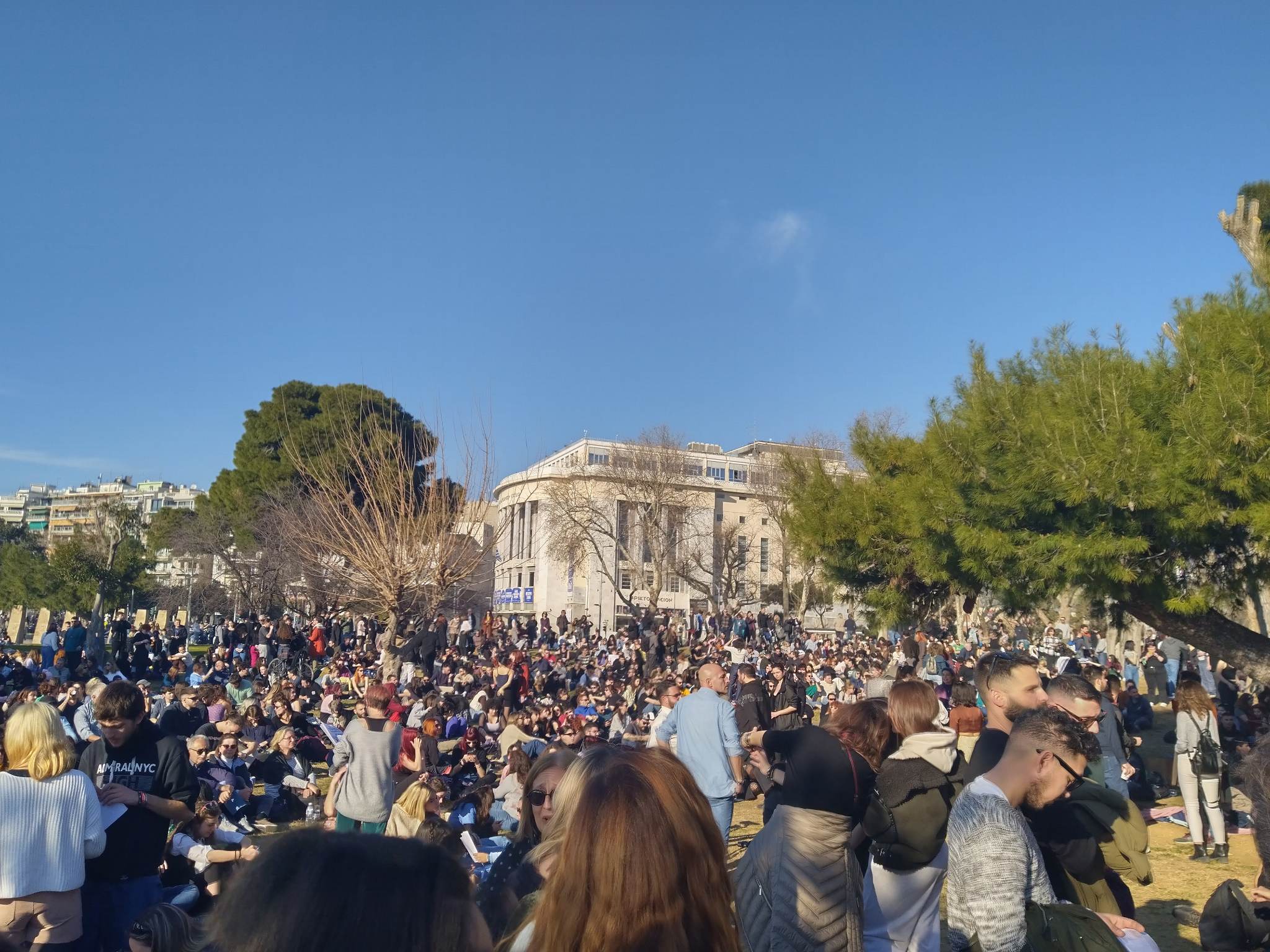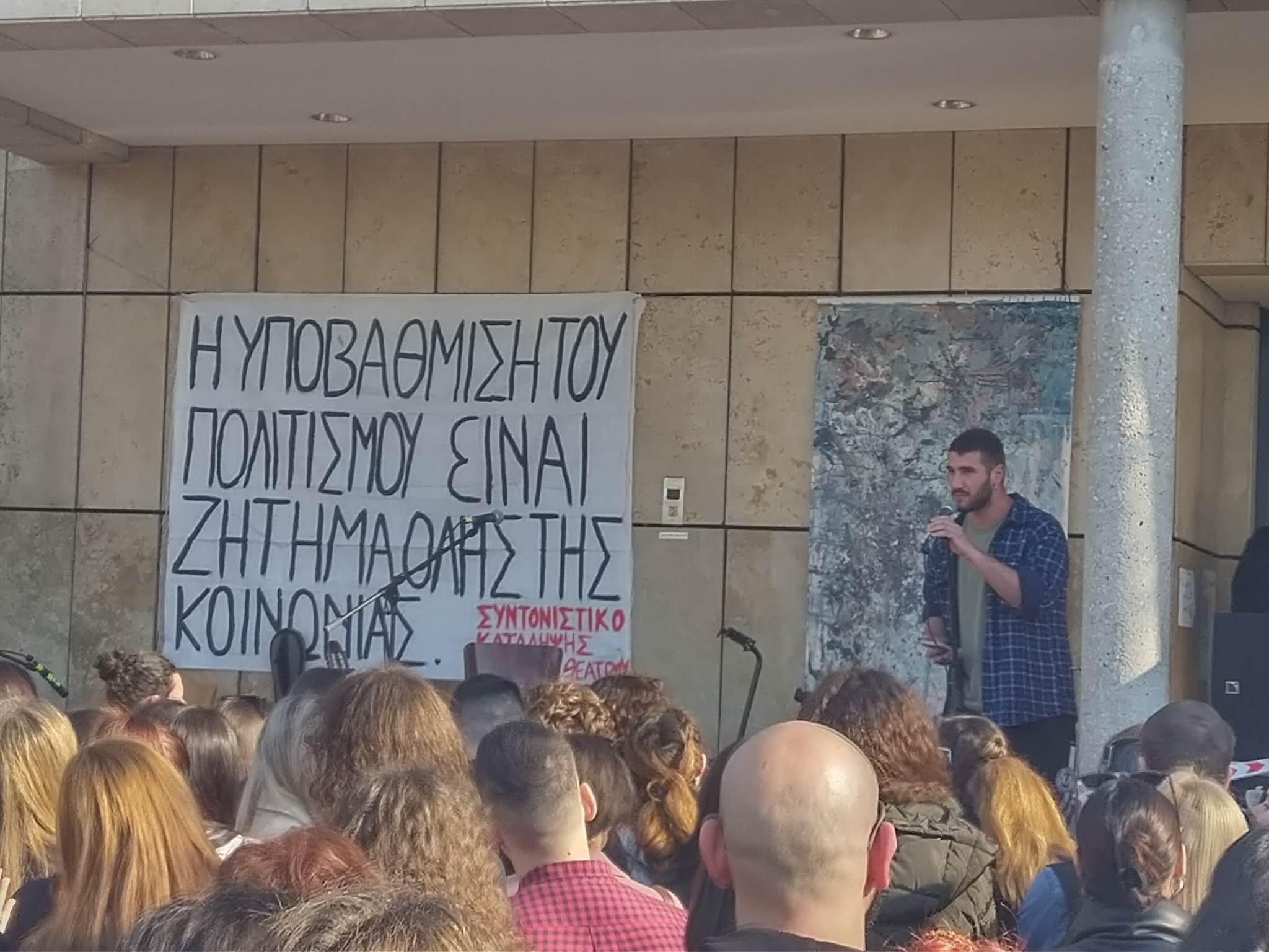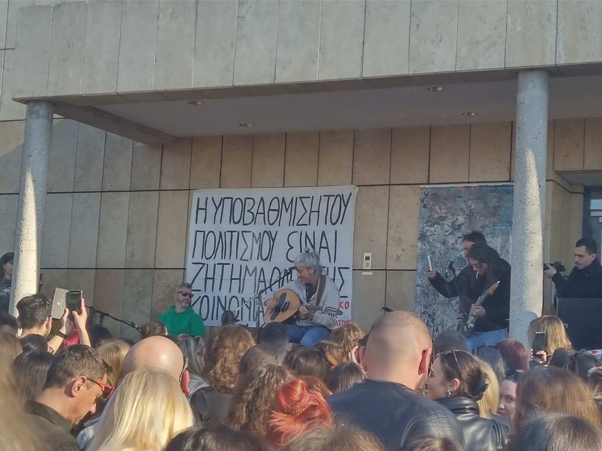 Πλήθος κόσμου έχει συγκεντρωθεί για δεύτερη μέρα στα γρασίδια του Θεάτρου στηρίζοντας τον αγώνα των καλλιτεχνών.