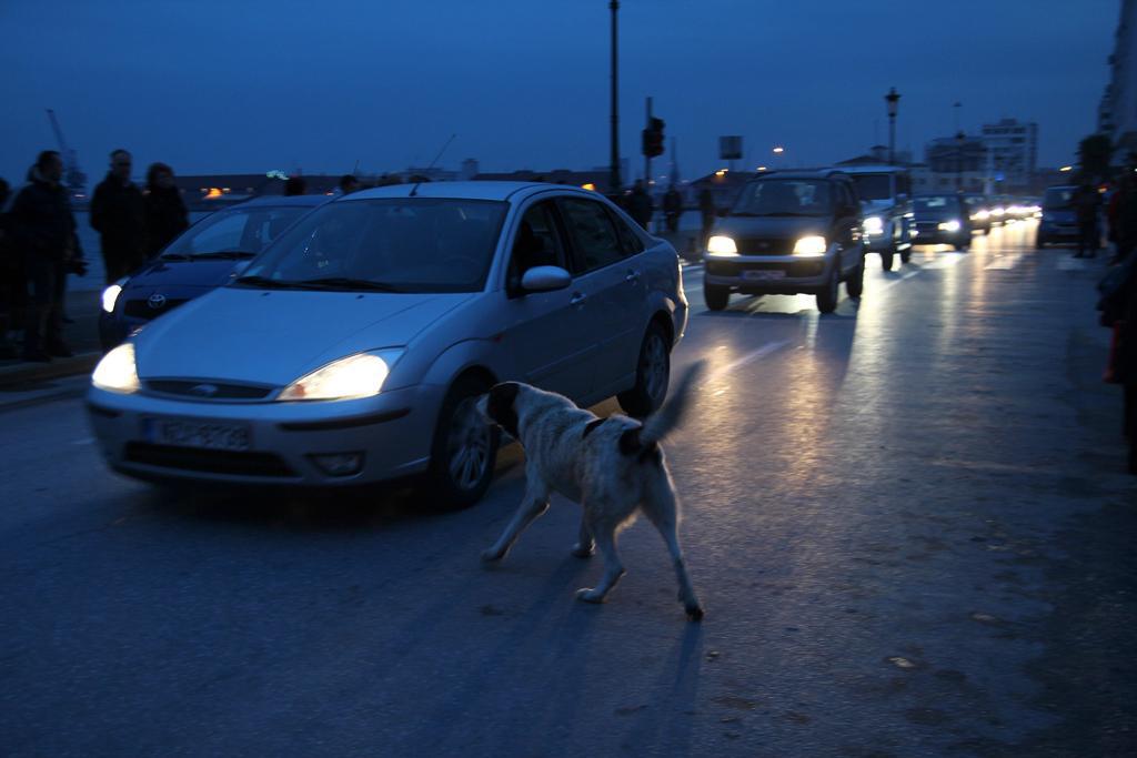 Λίγο αργότερα θα αρχίσει το γάυγισμα στα πρώτα αυτοκίνητα νομίζοντας πως αυτό αρκεί για να εξαφανιστούν οι θορυβώδεις μεταλλικές κατασκευές από το τοπίο. Θα μου θυμίσει τον Ιντεφίξ που ούρλιαζε απελπισμένος μπροστά στα κομμένα δέντρα. Θα αποχωρήσει νικημένος λίγα λεπτά αργότερα.