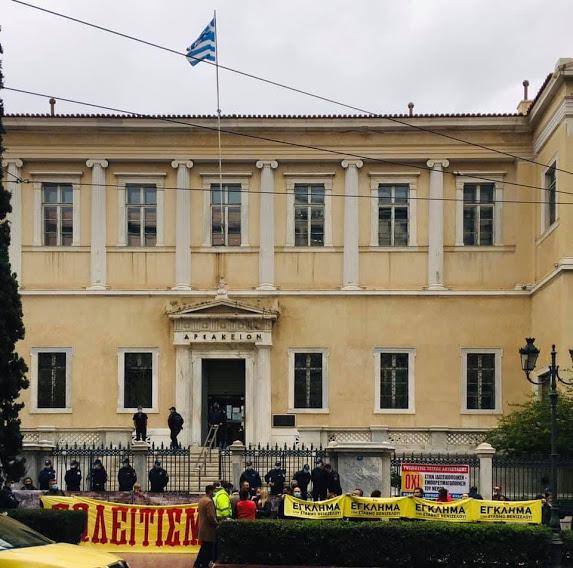Συμβολική παράσταση διαμαρτυρίας πραγματοποιείται έξω από το ΣτΕ για τα αρχαία του σταθμού «Βενιζέλου» στο Μετρό Θεσσαλονίκης.