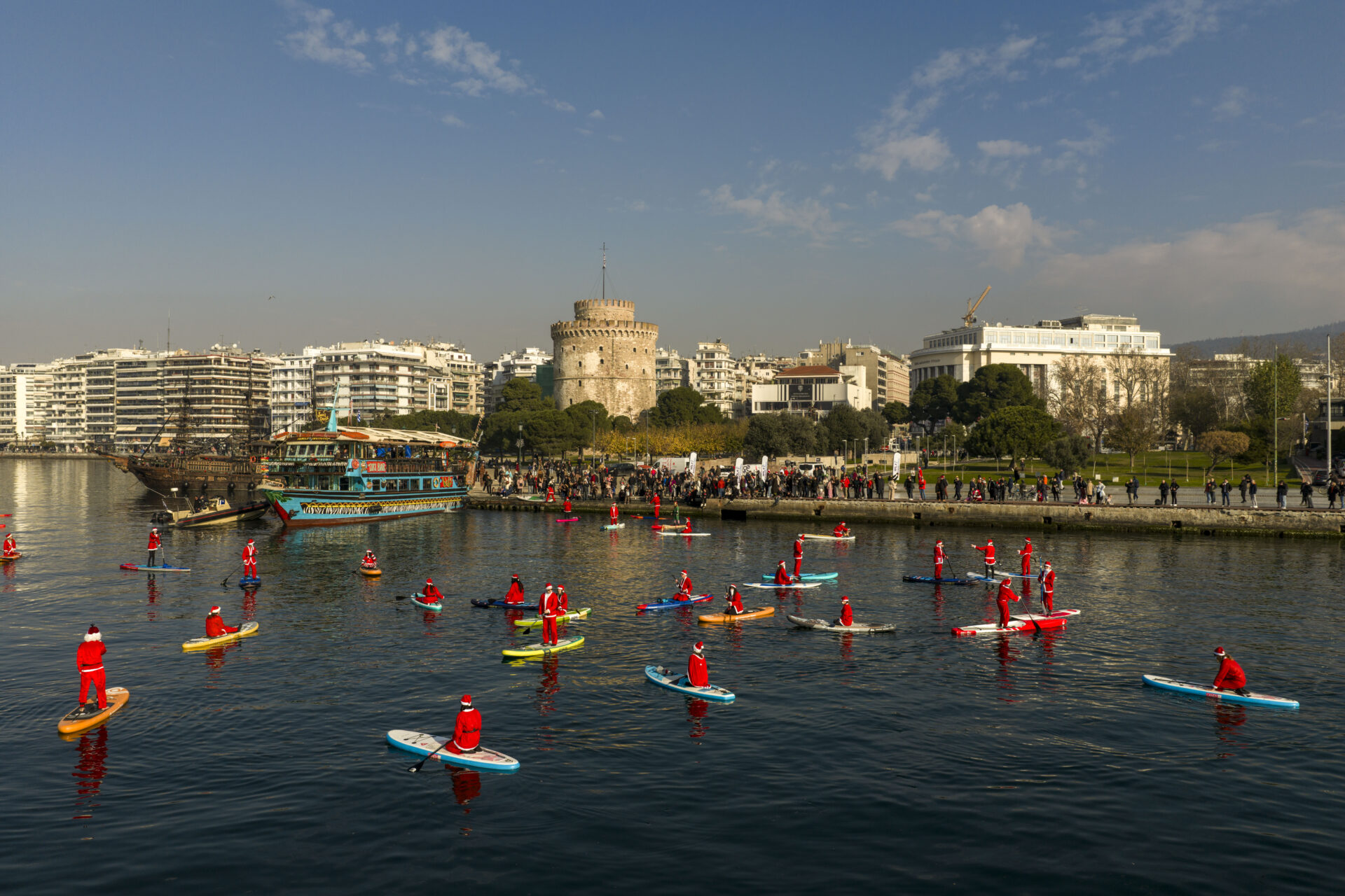 Οι Αγιοβασίληδες και οι Αγιοβασιλίτσες κωπηλάτησαν όρθιοι πάνω σε σανίδες SUP στα νερά του Θερμαϊκού κόλπου σε μια μοναδική διαδρομή από το Λευκό Πύργο έως το λιμάνι της πόλης, προσφέροντας πλούσιο θέαμα στους επισκέπτες που γέμισαν το παραλιακό μέτωπο της Θεσσαλονίκης.
