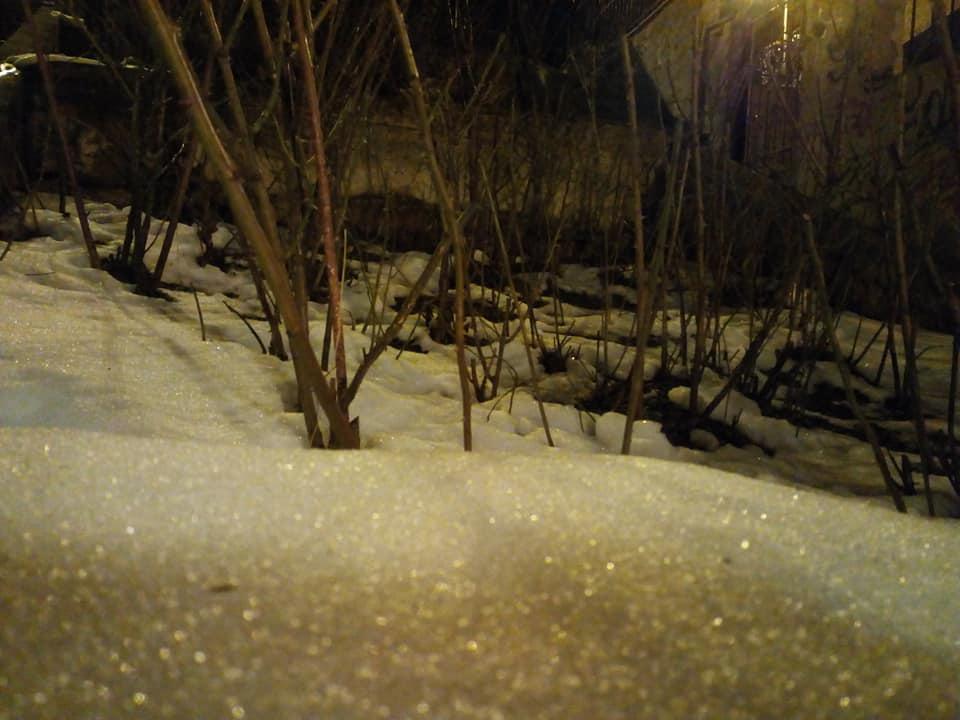 Ψηλά στις Συκιές, κοντά στην Επταπυργίου, το χιόνι που δεν έλιωσε ακόμα ανά σημεία στις γειτονιές δημιουργεί ένα εντυπωσιακό θέαμα τη νύχτα. Σε συνδυασμό με το ζεστό κίτρινο φωτισμό δημιουργεί την ψευδαίσθηση του “χρυσού” χρώματος.