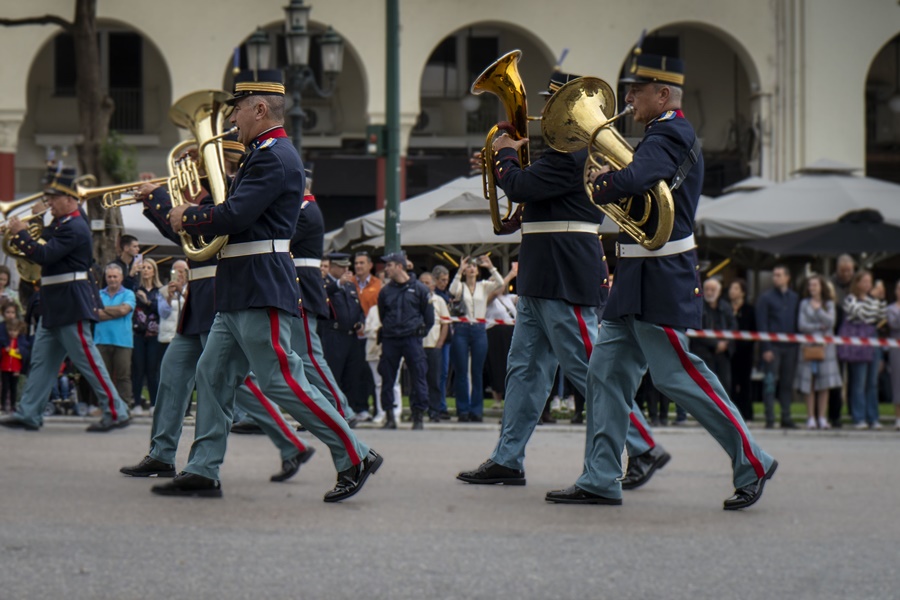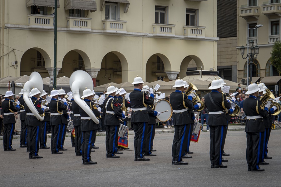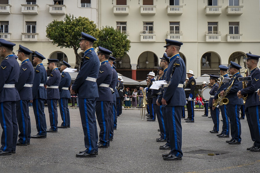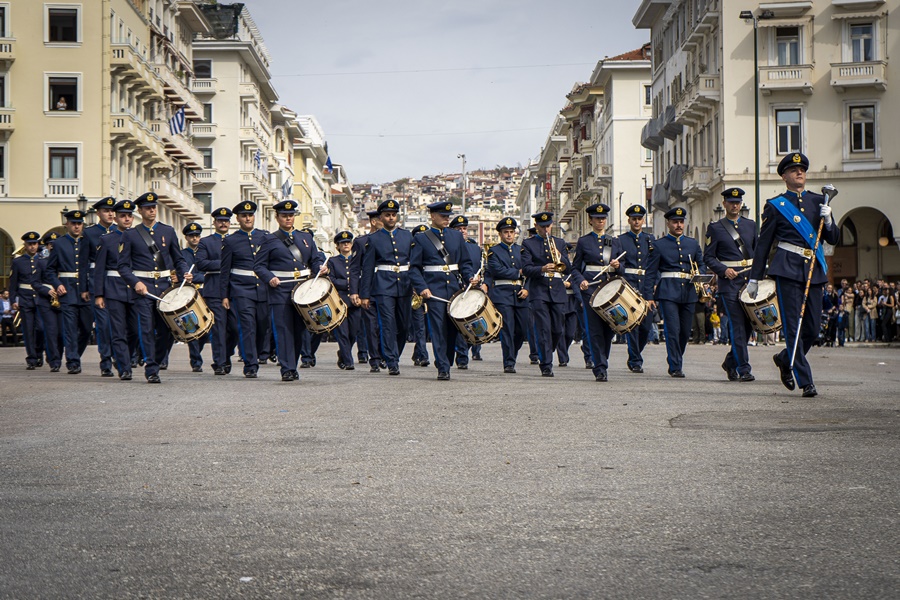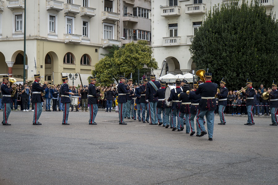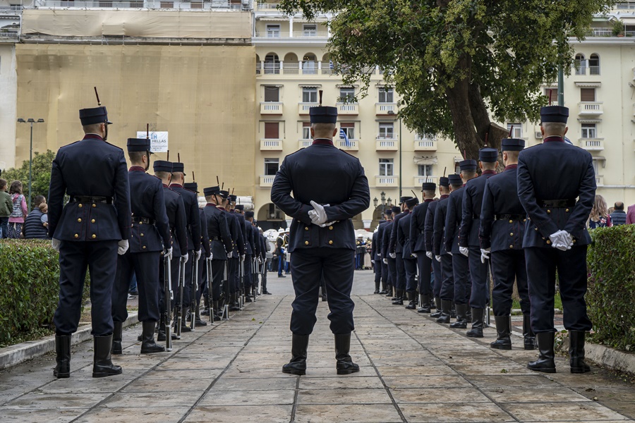 Με επιδέξιες κινήσεις κρατώντας στα χέρια τα όπλα τους, σε αρμονικό συγχρονισμό και άψογους σχηματισμούς οι σπουδαστές της στρατιωτικής σχολής Αξιωματικών Σωμάτων (ΣΣΑΣ), εντυπωσίασαν το πλήθος του κόσμου, που παρά τον άστατο καιρό, κατέκλυσε την πλατεία Αριστοτέλους.
