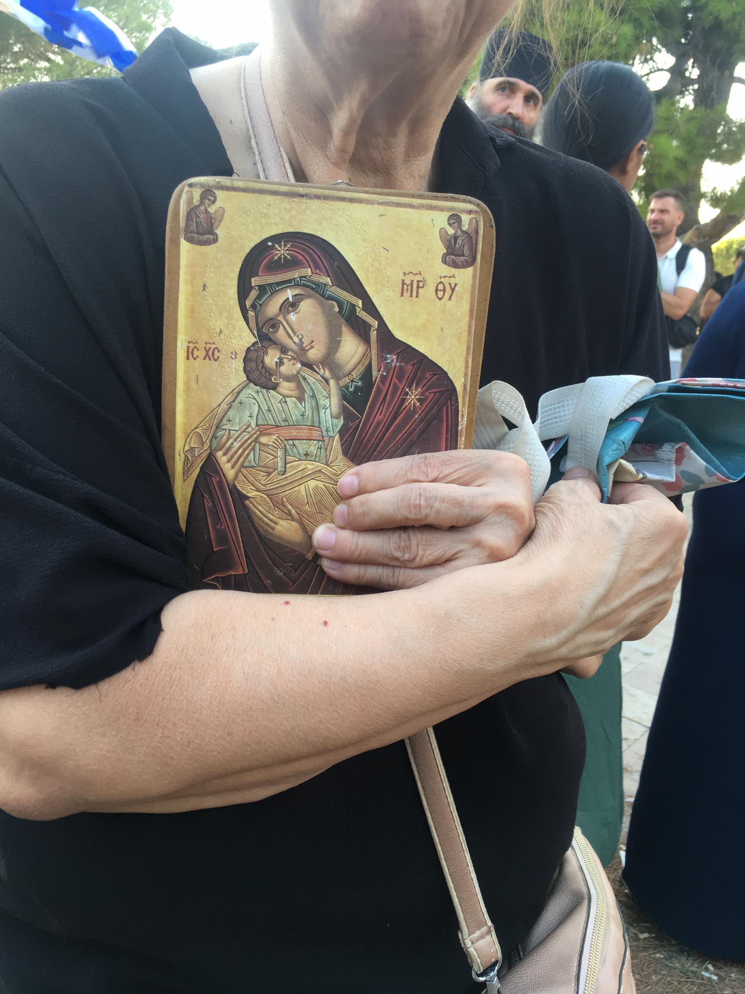 Πιστοί από τη βόρεια Ελλάδα που αντιδρούν στις νέες ταυτότητες, έφτασαν με λεωφορεία για να συμμετάσχουν.