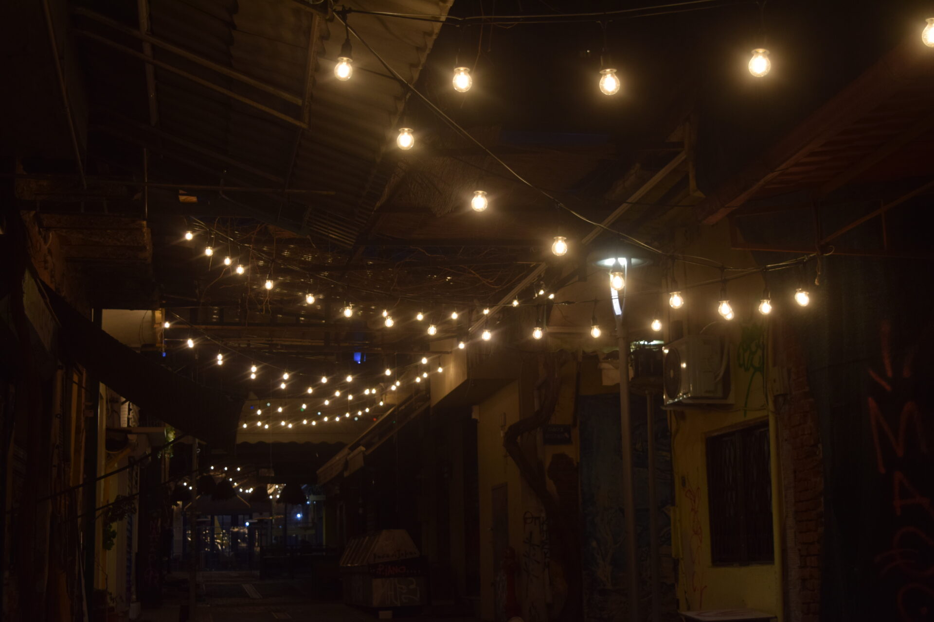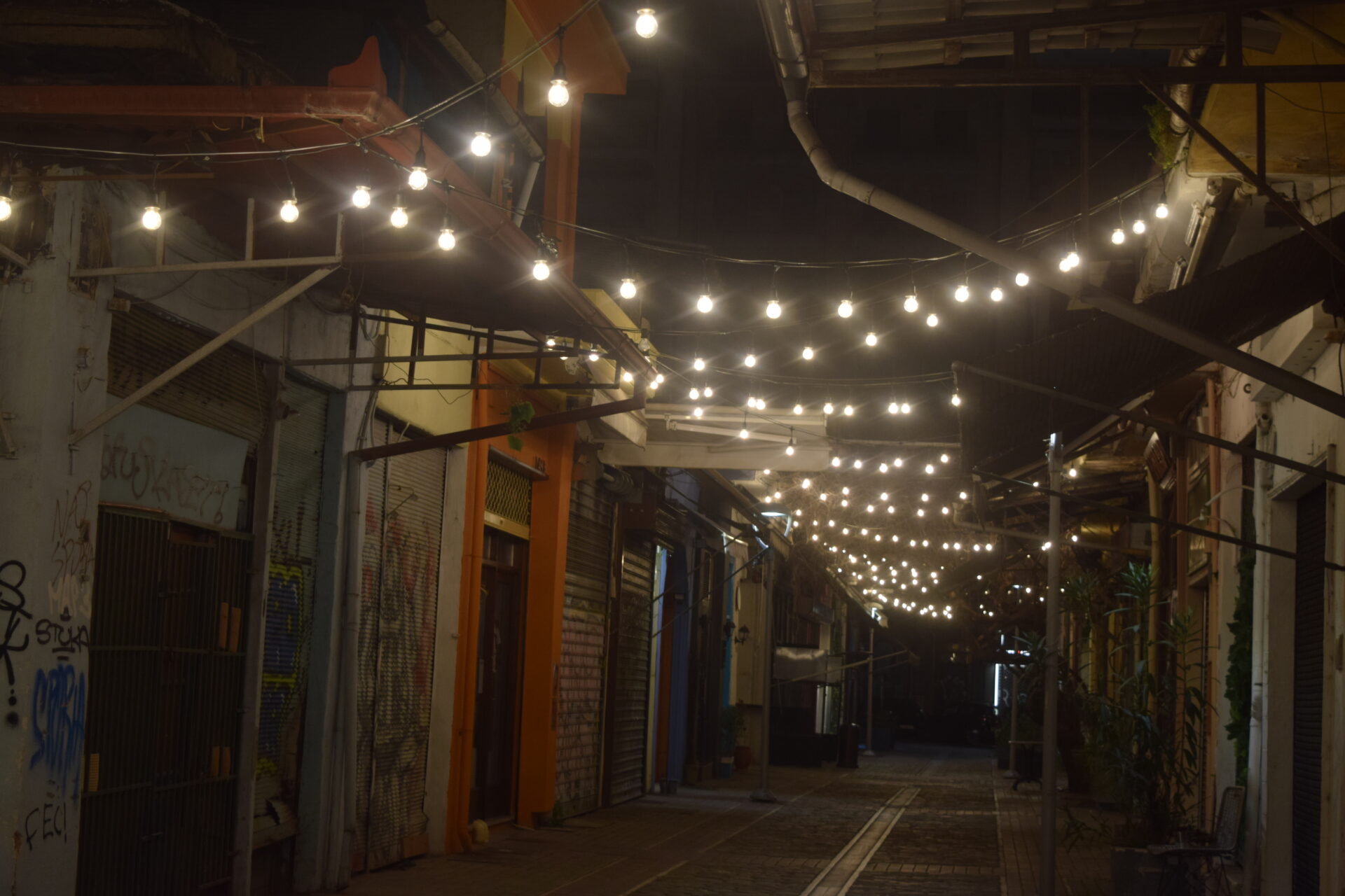 Λίγο μετά τις επτά το απόγευμα, και αφού αρχίζει να σουρουπώνει, οι γιρλάντες που είναι πλεγμένες στα κτίρια της Άθωνος φωτίζουν με τις λευκές τους στρογγυλές λάμπες τα στενά της πλατείας.