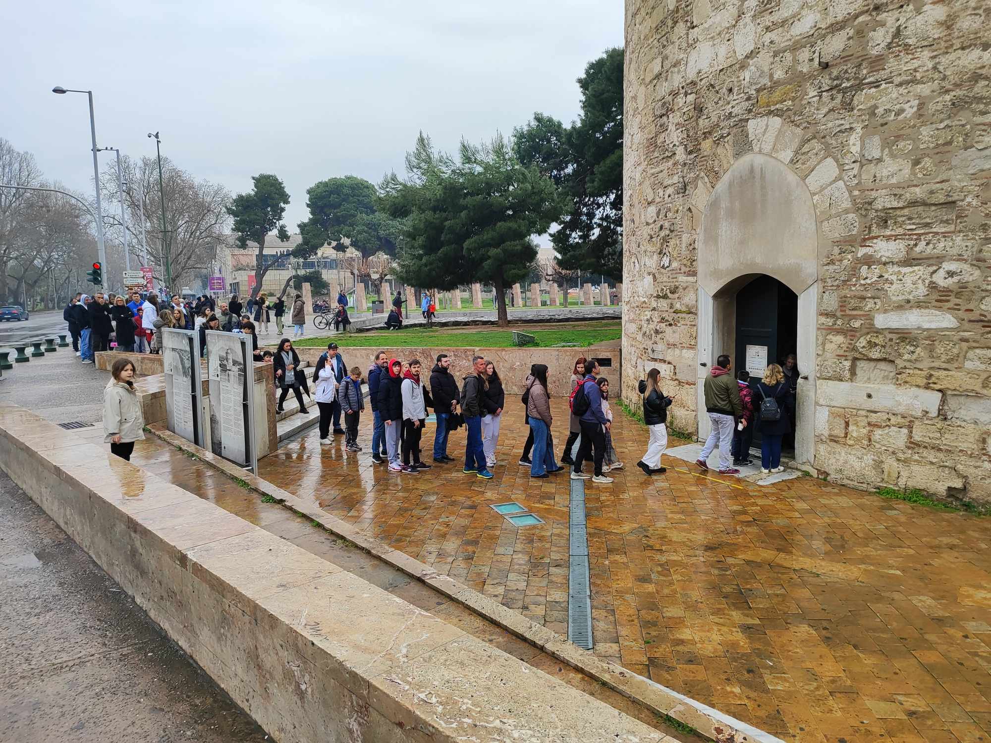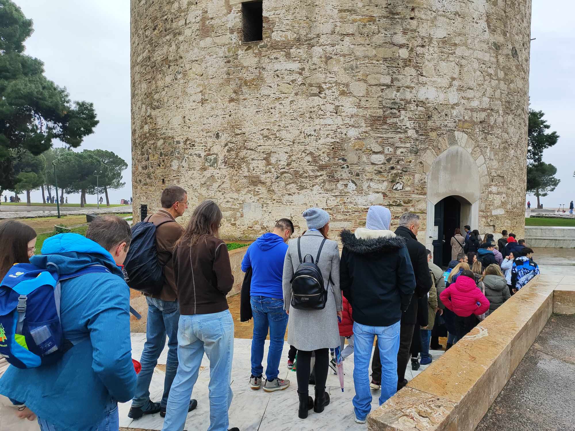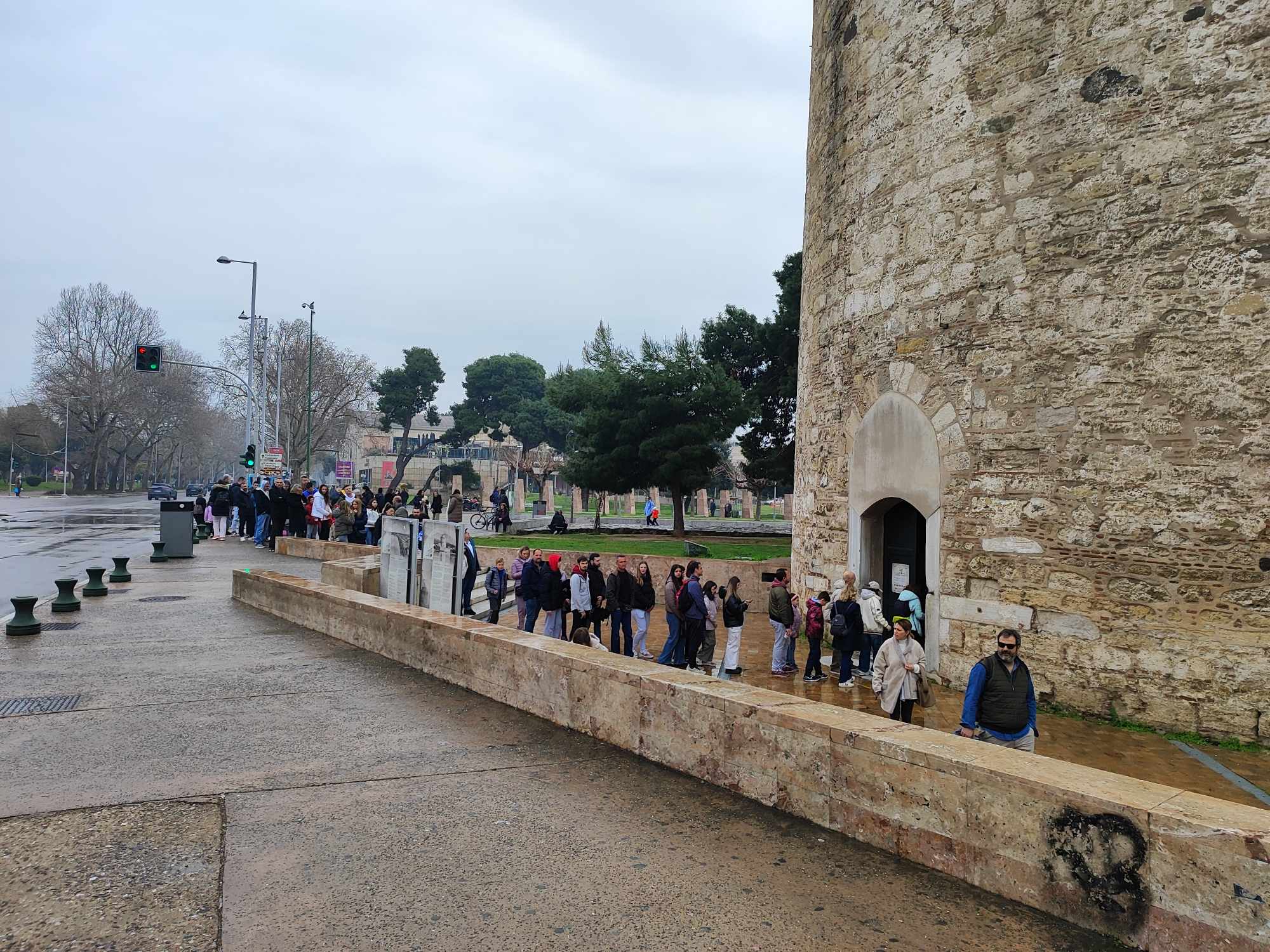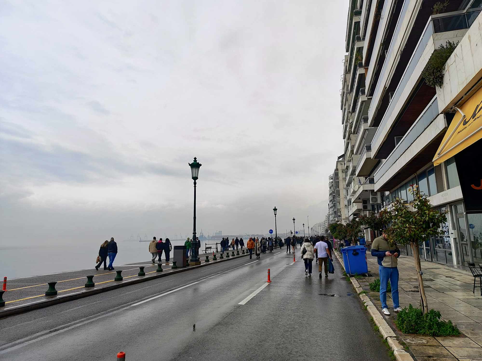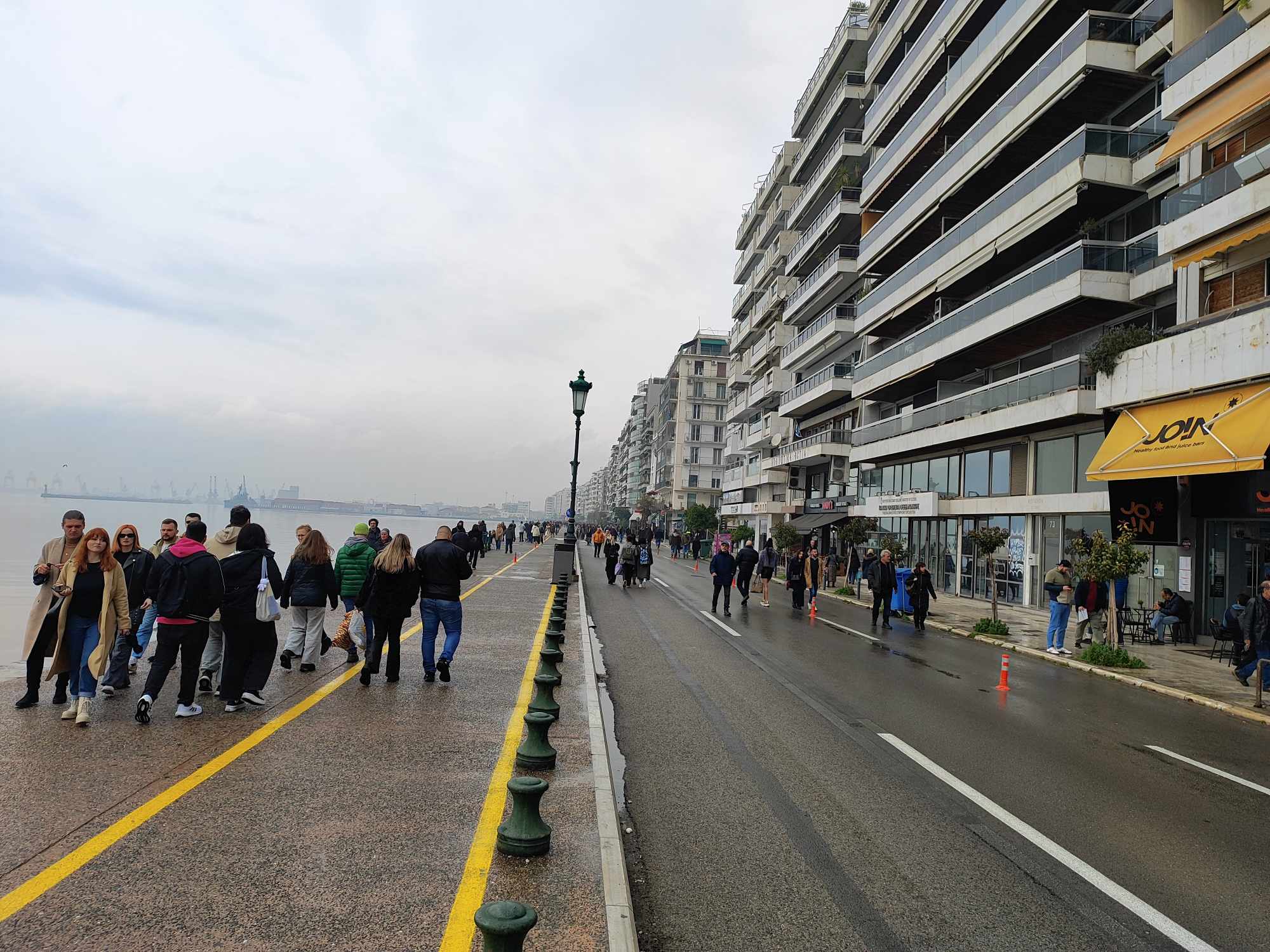 Παρά τον βροχερό καιρό, κάτοικοι και επισκέπτες της Θεσσαλονίκης απόλαυσαν τη βόλτα τους στην πεζοδρομημένη Λεωφόρο Νίκης, το σημερινό Κυριακάτικο μεσημέρι, ενώ αξιοσημείωτη ήταν η ουρά για την άνοδο στον Λευκό Πύργο.