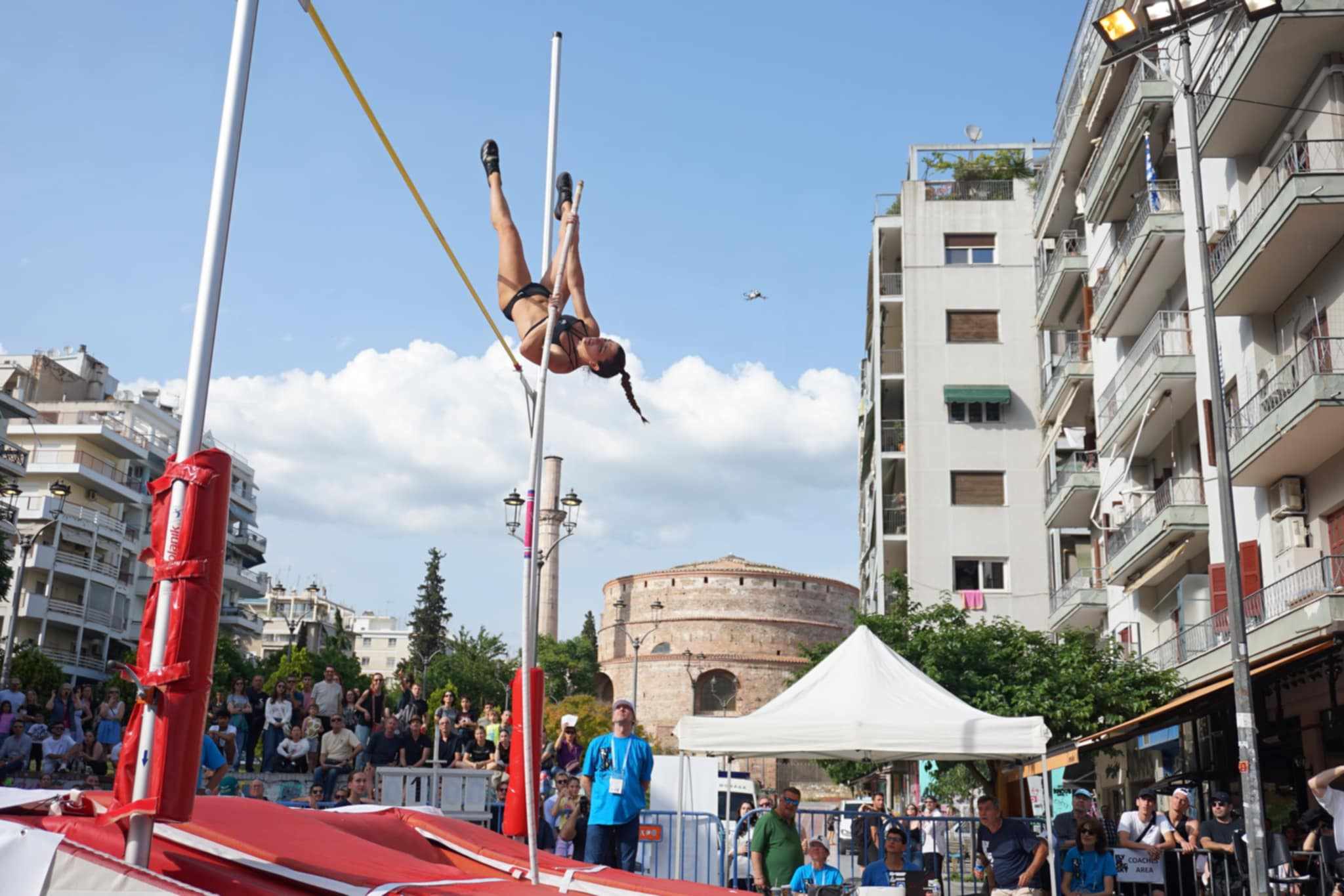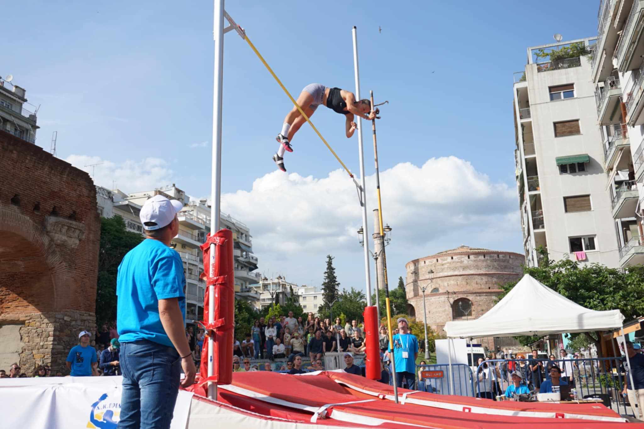 Η περιοχή της Καμάρας έχει μεταμορφωθεί σε ένα μικρό γήπεδο στίβου, για την διεξαγωγή του αγώνα άλματος επί κοντώ «Fly in SKG Sky», που πραγματοποιείται αυτή τη στιγμή σε ένα από τα κεντρικότερα σημεία της πόλης.