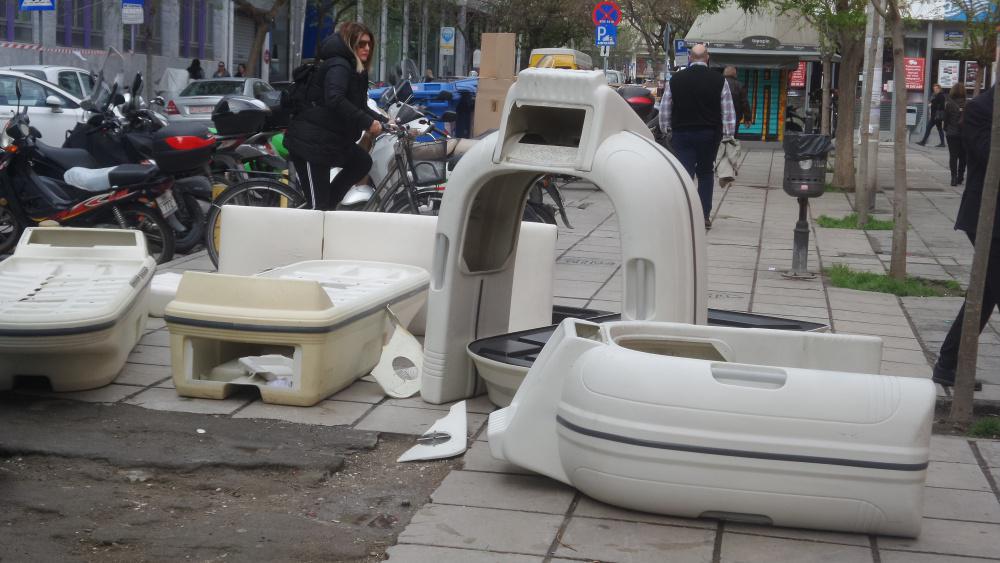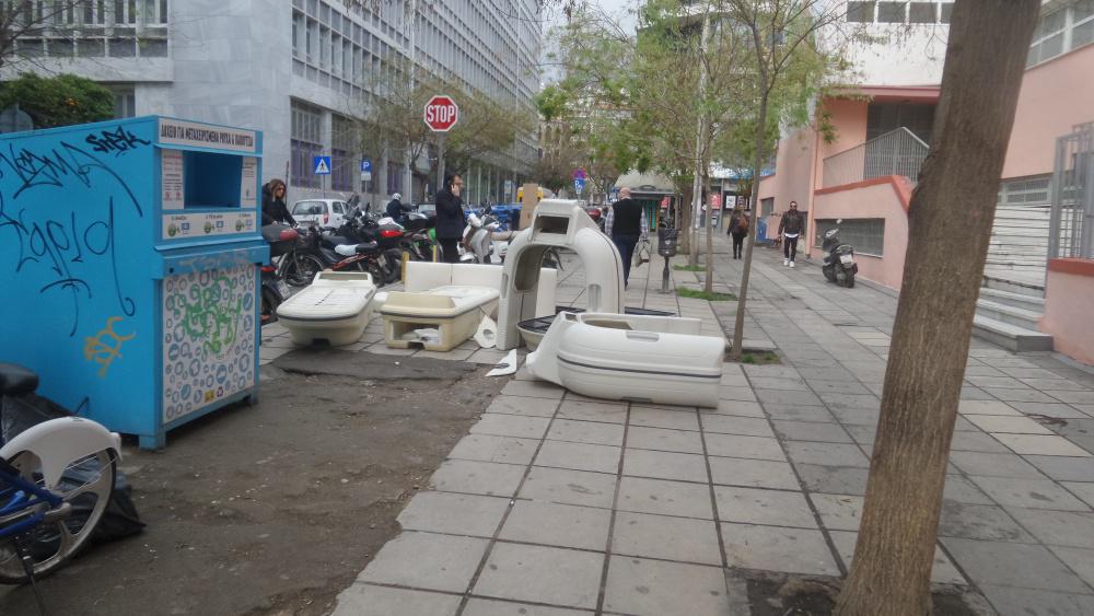 Σκουπιδότοπο θυμίζει σήμερα η Καρόλου Ντήλ, στο κέντρο της Θεσσαλονίκης. Και αυτό επειδή κάποιοι θεώρησαν σωστό, στο πλαίσιο ανακαίνισης (;;;), να πετάξουν πάνω στο πεζοδρόμιο ένα πεπαλαιωμένο μηχάνημα αδυνατίσματος. Ούτε ένα, ούτε δυο, αλλά επτά μεγάλα αντικείμενα περιμένουν.
