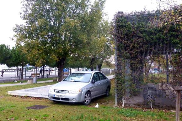 Πριν μερικές βδομάδες είχα πέσει σε μια παρόμοια περίπτωση στο πάρκο του Αλέξανδρου, πίσω από το άγαλμα του Καραμανλή. Ηλικιωμένο ζευγάρι έχει καβαλήσει το πεζοδρόμιο, έχει τροχοδρομήσει στο γκαζόν και παρκάρει με όλη του την άνεση στον περιβάλλοντα χώρο του άλλου αγάλματος πίσω από τον Καραμανλή. Χειρόφρενο και ο κύριος αποβιβάζεται μετά της κυρίας του και ετοιμάζονται για βόλτα. Εμβρόντητη τους κοιτώ. “Απαγορεύεται το παρκάρισμα και η είσοδος στη Νέα Παραλία με το αυτοκίνητο”, τους λέω. Εμβρόντητος κι αυτος και φανερά ενοχλημένος. Μα γεράσαμε μου λέει πού να περπατάμε.Η κυρά μου πονάει το πόδι της. Μα μπορείτε να παρκάρετε 50 μέτρα πιο πάνω στο δρόμο, συνεχίζω μην θέλοντας να γίνω και αγενής αλλά ήδη έχω αρχίσει να μπαρουτιάζω. Με κοιτάει. Είναι φανερό ότι του έχω χαλάσει τη μέρα. Στέκεται. Καλά θα φύγουμε, μου λέει και περιμένει. Περιμένω κι εγώ. Ξέρω ότι αν φύγω, το αυτοκίνητο θα μείνει εκεί. Λυπάμαι που σας χαλάω το πρόγραμμα του λέω αλλά θα καλέσω την τροχαία αν δεν φύγετε τώρα. Με μίσησε, γύρισε, μπήκε στο αυτοκίνητο και έβαλε μπρος. Απίστευτο και όμως συνέβη. Όπως συνέβη και η μεγαλοπρεπής είσοδος σε ένα από τα θεματικά πάρκα του αυτοκινήτου της φωτογραφίας. Έχει δει πολλά και θα δει ακόμα περισσότερα η Νέα Παραλία μας, όπως βλέπει καθημερινά το μεγαλύτερο μέρος του δημόσιου χώρου της πόλης αν δεν βάλουμε μυαλό σαν ευσυνείδητοι πολίτες, που δεν είμαστε. Ευτυχώς όχι όλοι και θέλω να πιστέυω ότι οι σκεπτόμενοι είμαστε πολύ περισσότεροι και θα τους “φέρουμε στον ίσιο δρόμο” κάποια στιγμή.