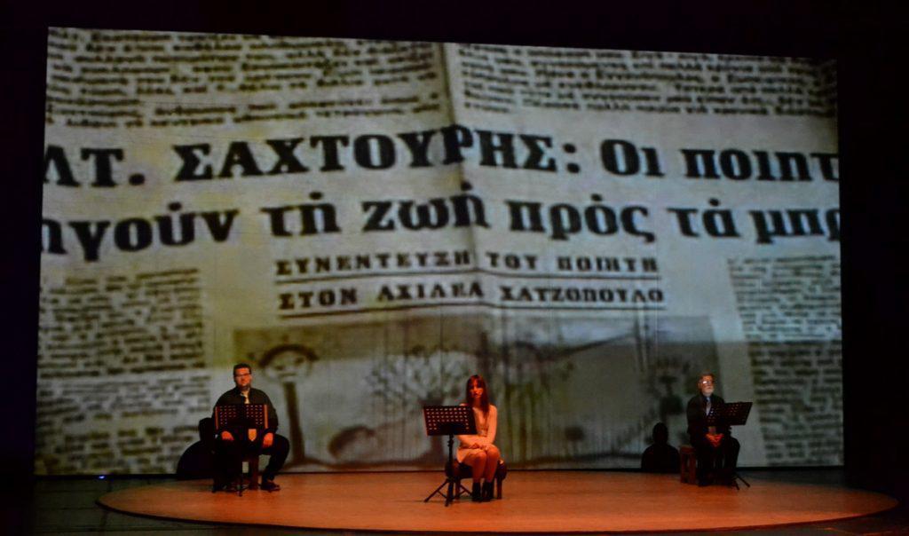 Το Κρατικό Θέατρο Βορείου Ελλάδος γιόρτασε χθες την Παγκόσμια Ημέρα Ποίησης τιμώντας τους ποιητές Μιχάλη Κατσαρό και Μίλτο Σαχτούρη. Με αφορμή 100 χρόνια από τη γέννηση των δύο ξεχωριστών ποιητών της Μεταπολεμική γενιάς, ηθοποιοί του ΚΘΒΕ διάβασαν ποιήματα, ενώ για το έργο τους μίλησαν οι καθηγητές του Τμήματος Φιλολογίας του ΑΠΘ, Ιωάννα Ναούμ και Μιχάλης Μπακογιάννης.