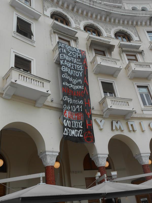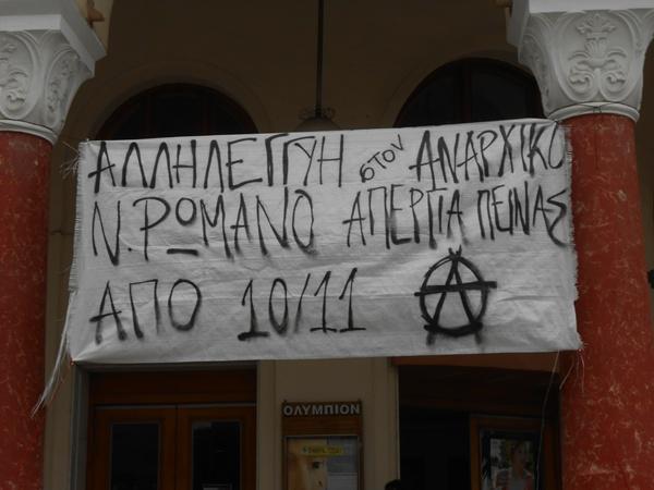 Aπό χθες το μεσημέρι προχώρησαν σε κατάληψη του κινηματογράφου «Ολύμπιον», στην πλατεία Αριστοτέλους, αντεξουσιαστές. Από τα μεγάφωνα ακούγονται δηλώσεις συμπαράστασης ενώ χτες το βράδυ είχε μαζευτεί μέσα και έξω από το Ολύμπιον πολύς κόσμος, κυρίως νέοι. Υπό κατάληψη τελεί, επίσης από προχθές, το κτίριο διοίκησης του Αριστοτελείου Πανεπιστημίου Θεσσαλονίκης (ΑΠΘ) από ομάδα φοιτητών που ζητούν να ικανοποιηθεί το αίτημα του απεργού πείνας Νίκου Ρωμανού να σπουδάσει.