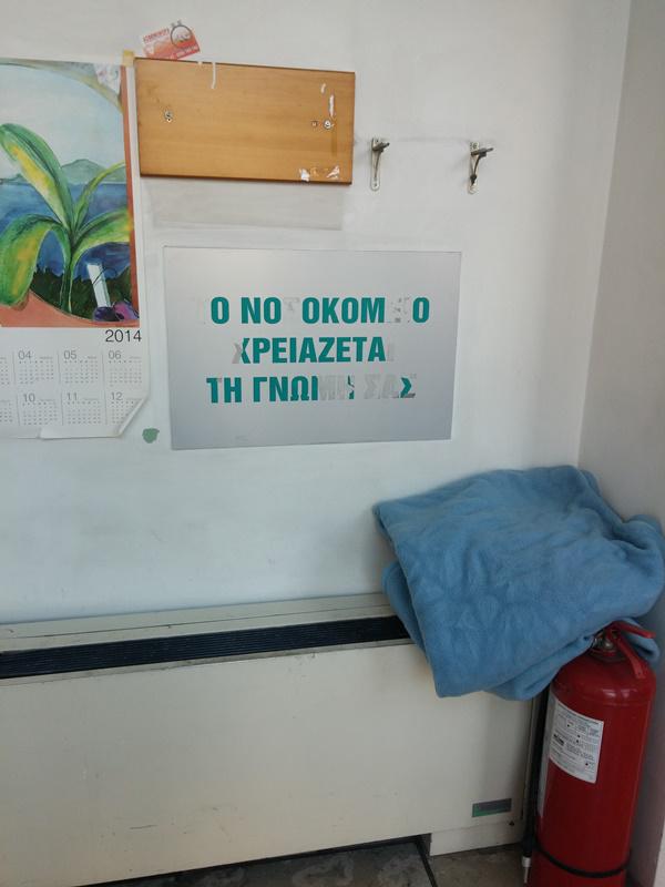 Αν όμως δυσκολεύομαι να καταγράψω τα (α-)πρόσωπα δε συμβαίνει το ίδιο με το χώρο. Ο χώρος διαμεσολαβείται από την ανθρώπινη παρουσία ενώ ταυτόχρονα διαμεσολαβεί την τελευταία (όπως λένε και οι ανθρωπολόγοι). Μία κουβέρτα διπλωμένη επάνω σε ένα καλοριφέρ και τακτοποιημένες μαύρες σακούλες μαρτυρούν ότι ο χώρος είχε ή ίσως θα αποκτήσει «πρόσωπο». Πάνω από την κουβέρτα μία ταμπέλα –ειρωνεία- προσπαθεί να υποστηρίξει με μισοσβησμένα γράμματα ότι «το νοσοκομείο χρειάζεται τη γνώμη μας».