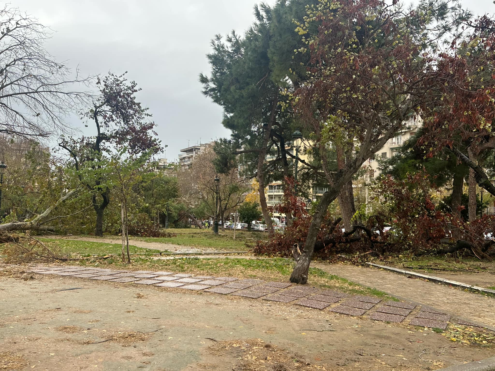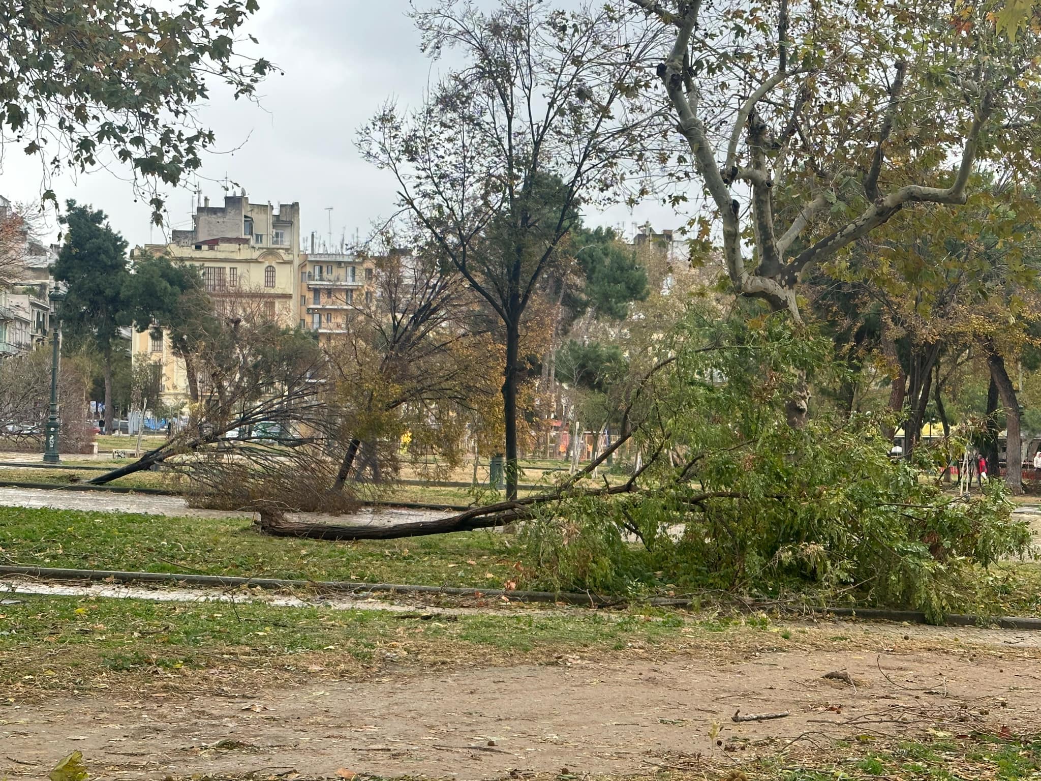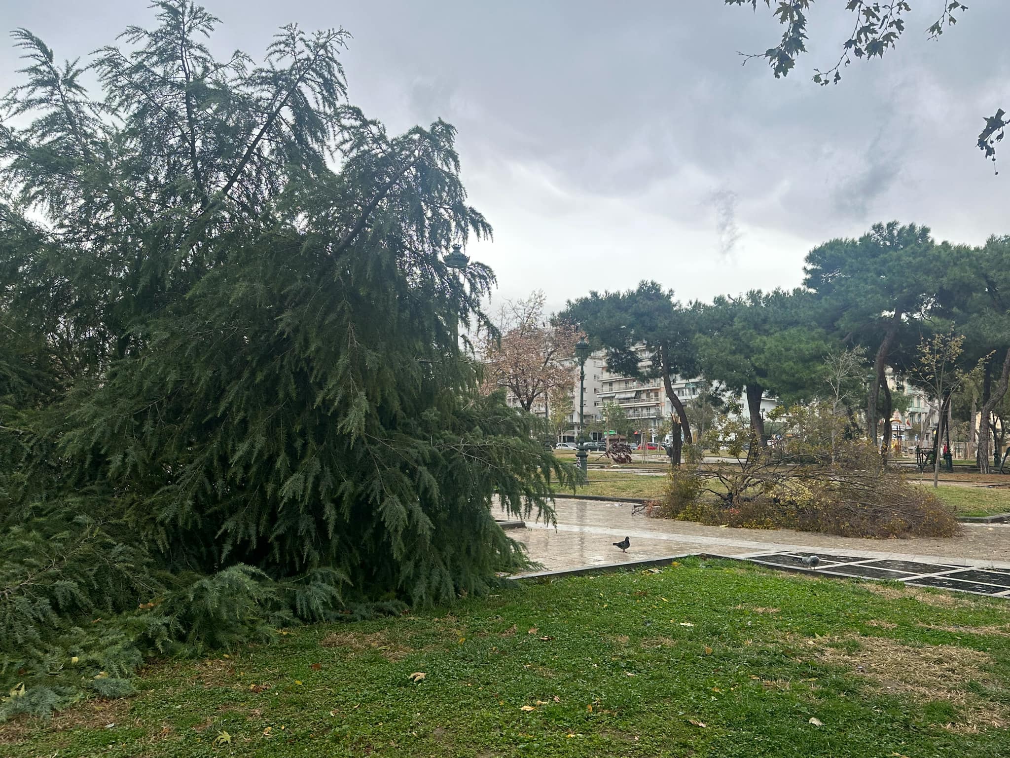 Στο πάρκο της Ρωμαϊκής Αγοράς μάλιστα, πίσω από ξύλινα σπιτάκια που έχουν στηθεί για το Χριστουγεννιάτικο Χωριό, πολλά δέντρα έχουν ξεριζωθεί, με τους κορμούς τους πλέον, να καλύπτουν το έδαφος, τα δρομάκια, ακόμη και τα παγκάκια.