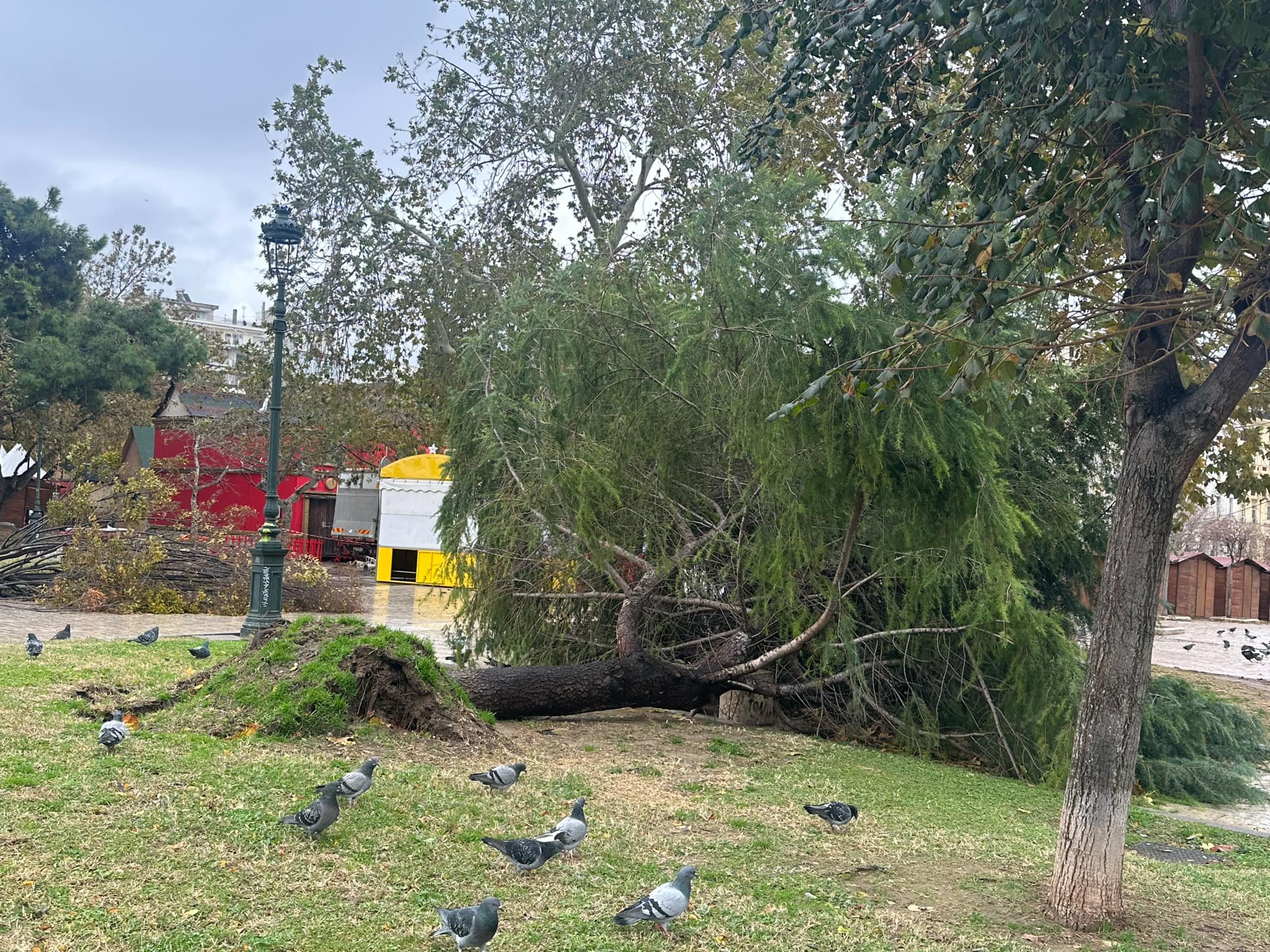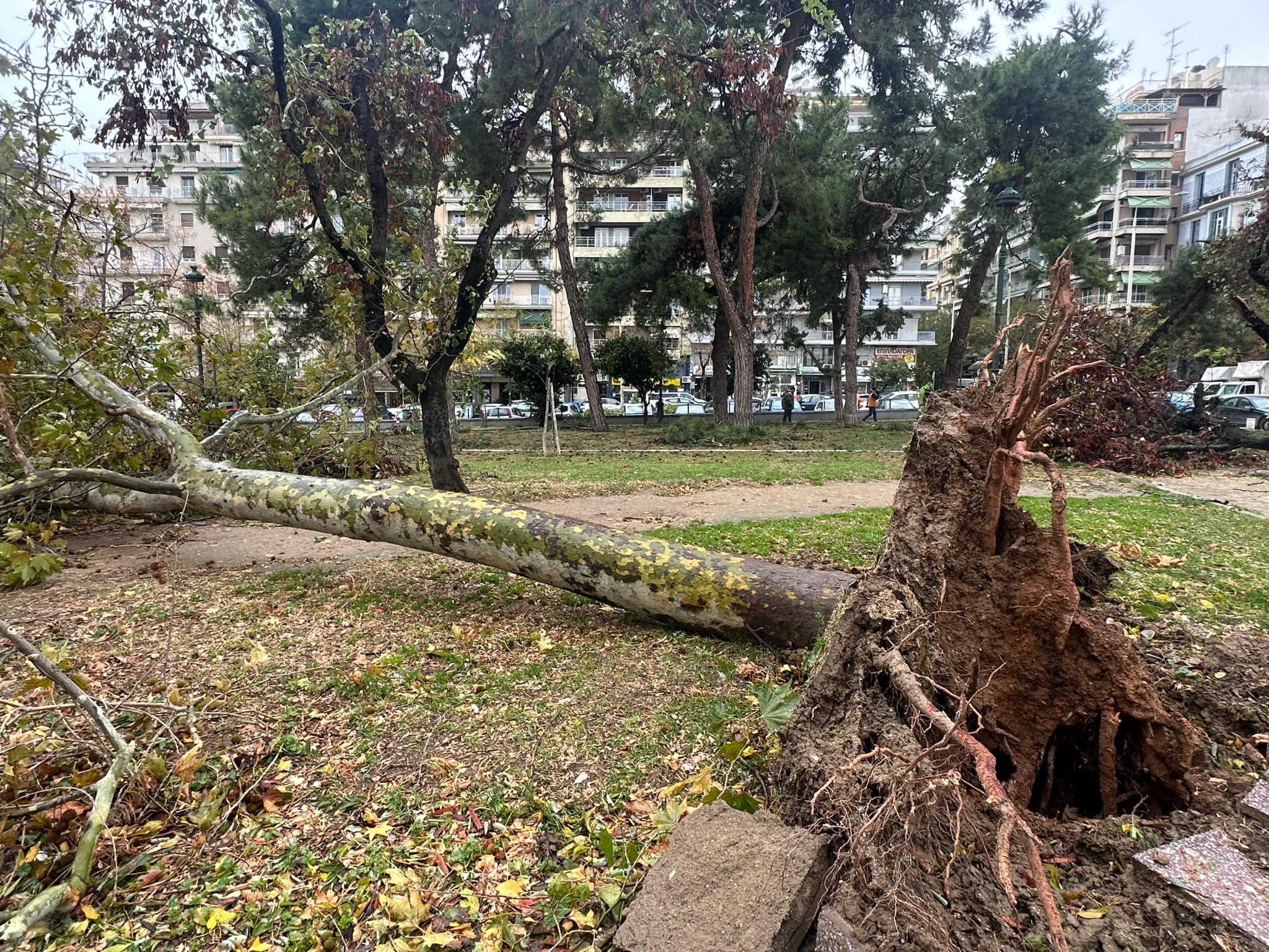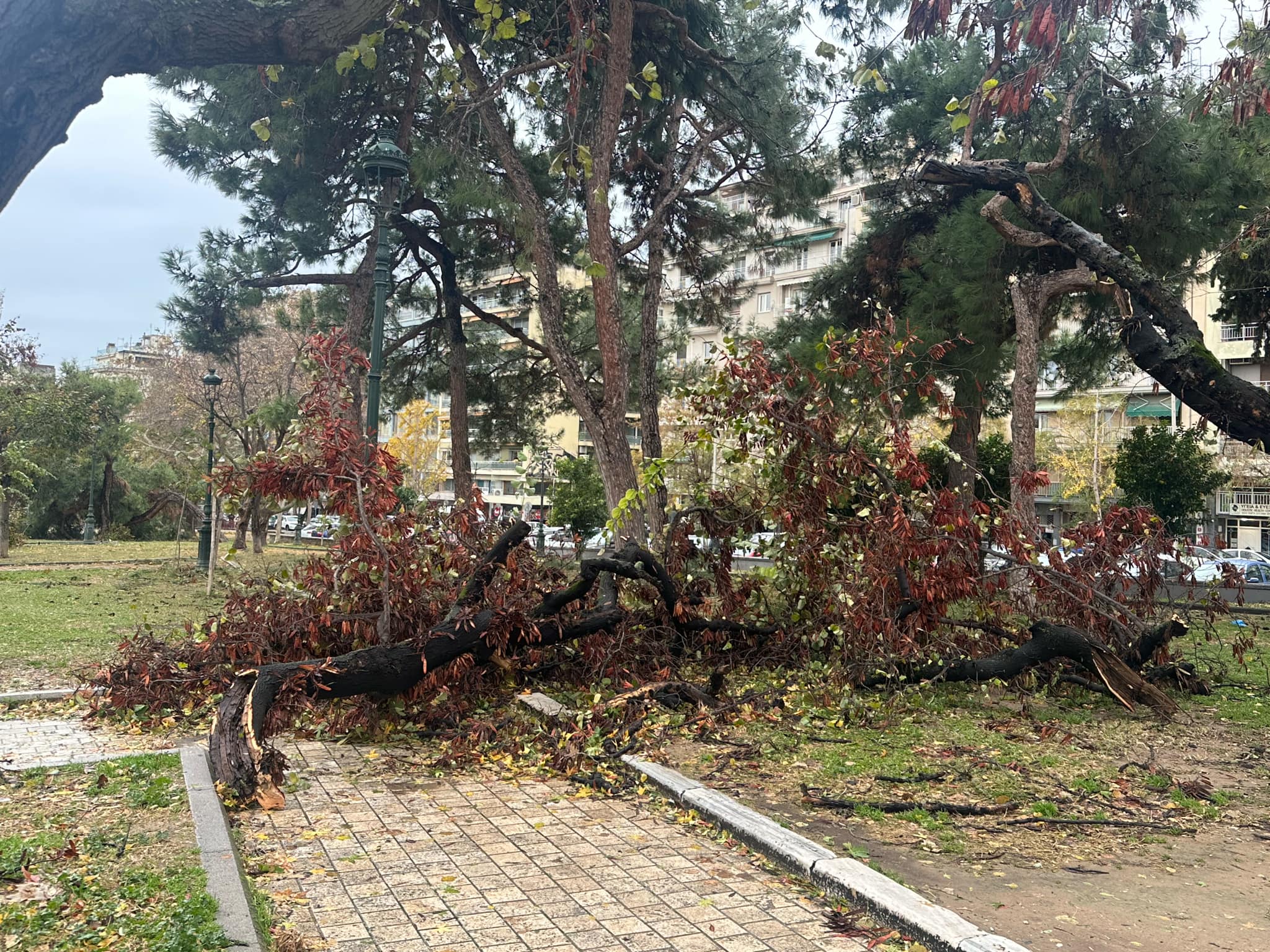 Στο πάρκο της Ρωμαϊκής Αγοράς μάλιστα, πίσω από ξύλινα σπιτάκια που έχουν στηθεί για το Χριστουγεννιάτικο Χωριό, πολλά δέντρα έχουν ξεριζωθεί, με τους κορμούς τους πλέον, να καλύπτουν το έδαφος, τα δρομάκια, ακόμη και τα παγκάκια.