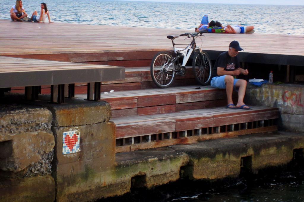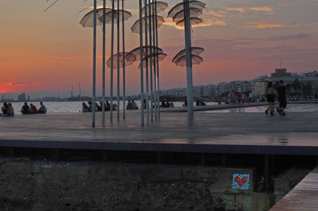 Η Νέα Παραλία αναπλάστηκε σε όλο το μήκος της επιφάνειάς της αλλά η κάθετη πλευρά του θαλάσσιου μετώπου, εκεί όπου σκάει το κύμα, παρέμεινε όπως ακριβώς ήταν πριν την ανάπλαση. Τα τσιμέντα σε πολλά σημεία έχουν φαγωθεί από τη θάλασσα και είναι πολλοί αυτοί που παρατήρησαν από την πρώτη μέρα της παράδοσης της Νέας παραλίας την άσχημη εικόνα του σαθρού μπετόν στην οποία πέφτει το μάτι του περιπατητή. Φαίνεται πως κάποιος αποφάσισε πως αυτό το μπετόν είναι ο ιδανικός καμβάς για μια εικαστική παρέμβαση. Τα πλακάκια με τις χρωματιστές καρδιές φτιαγμένες με ψηφίδες πολλαπλασιάζονται μέρα με τη μέρα. Στην αρχή ήταν μια καρδιά σε διάφορα σημεία λίγο πάνω από την επιφάνεια της θάλασσας. Σε κάποια από αυτά ο ρομαντικός δράστης φαίνεται να έχει εκτελέσει ακροβατικά για την τοποθέτησή τους. Τις τελευταίες μέρες φαίνεται να συνεχίζει τις εργασίες επιθυμώντας να καλύψει μεγαλύτερο μέρος της γκρίζας επιφάνειας. Άγνωστη παραμένει η ταυτότητα του δράστη, όπως και οι προθέσεις του. Στην Νέα Παραλία βέβαια κόσμος πάει κι έρχεται πια όλες τις ώρες της μέρας και της νύχτας και φαίνεται πως το να εκτελέσει το έργο του κρυφά γίνεται όλο και πιο δύσκολο. Στην πιο κάτω φωτογραφία φαίνεται καθαρά πως δεν πρόλαβε να τελειώσει το πλακάκι… κάποιος μάλλον τον “έπιασε στα πράσα”…